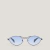 Genny sunglasses with a minimalist gold metal frame and dark lenses, featuring a sophisticated and elegant cat-eye design. The slim temples are adorned with distinctive details, including the iconic three-dimensional orchid symbol, embodying femininity and refinement. The uniquely shaped lenses add a modern and glamorous touch, ideal for completing luxurious looks.