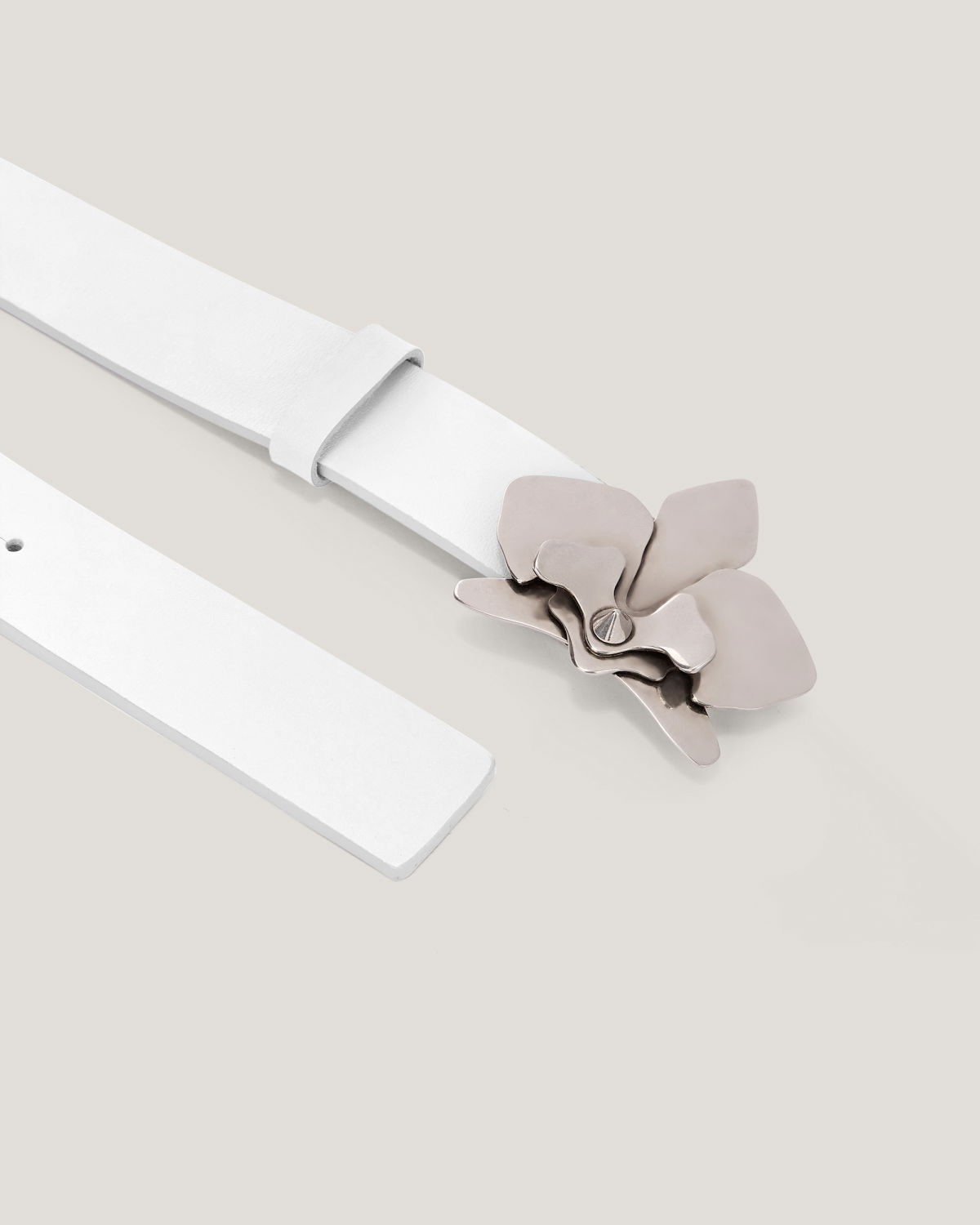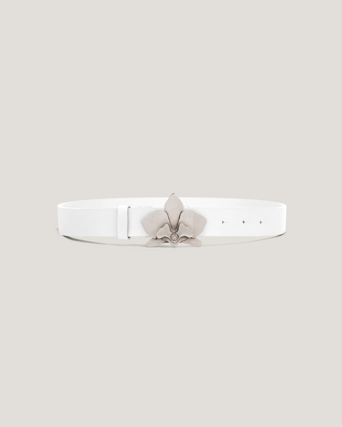 Slim belt, featuring a polished metal buckle shaped as an orchid flower. A sophisticated and feminine accessory, ideal for completing elegant looks with an iconic touch.