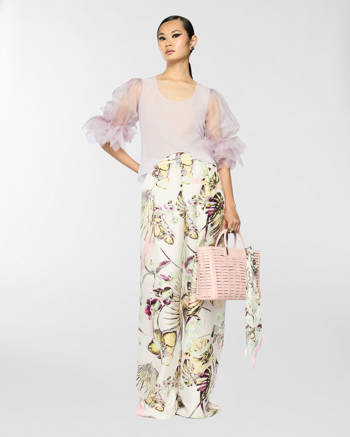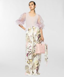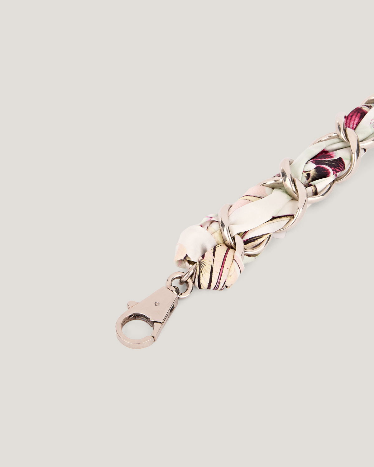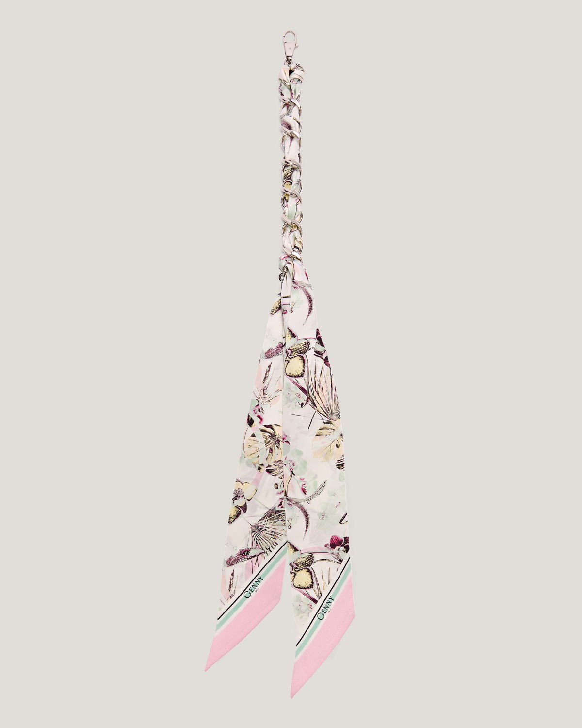 The silk charm scarf with Jungle Orchids print is an elegant and versatile accessory, perfect for enhancing any look with a unique touch of style. Made from pure silk, it features a floral pattern inspired by the vibrancy of the jungle and a sophisticated color palette. The shiny metal chain weave and practical lobster clasp make it ideal for decorating bags, belts, or other accessories. With dimensions of 21 x 33 cm, it embodies the exquisite craftsmanship and design of Genny.