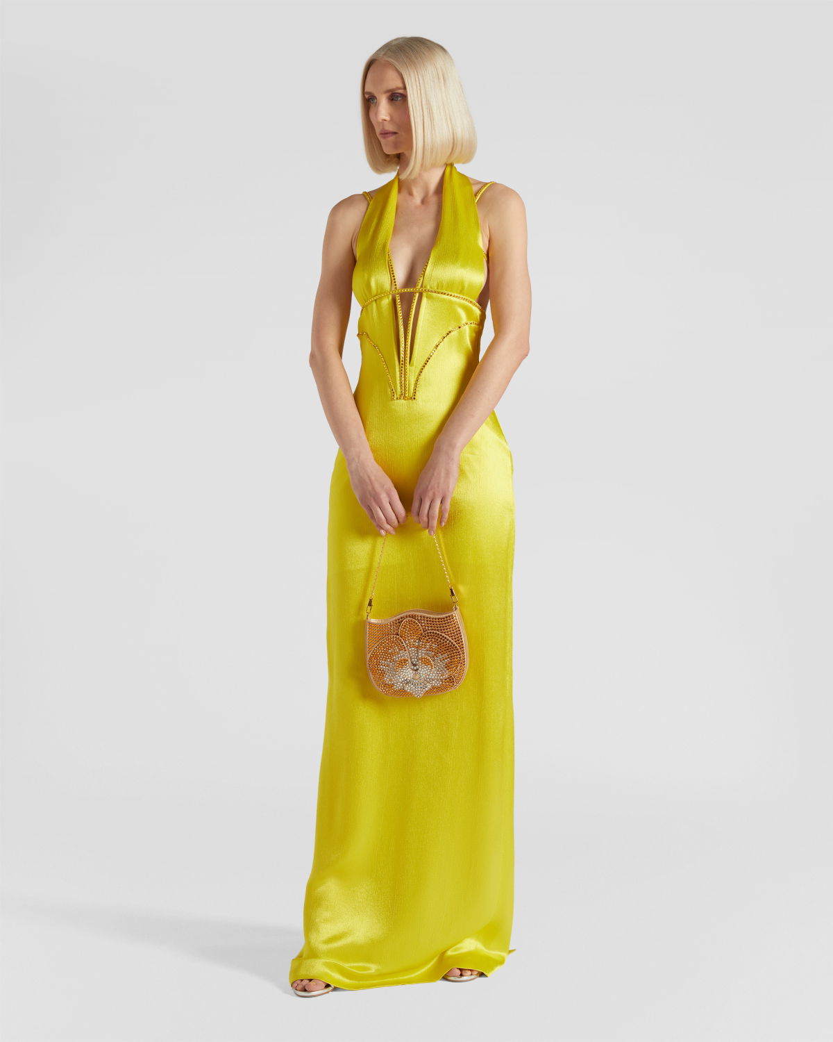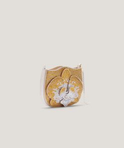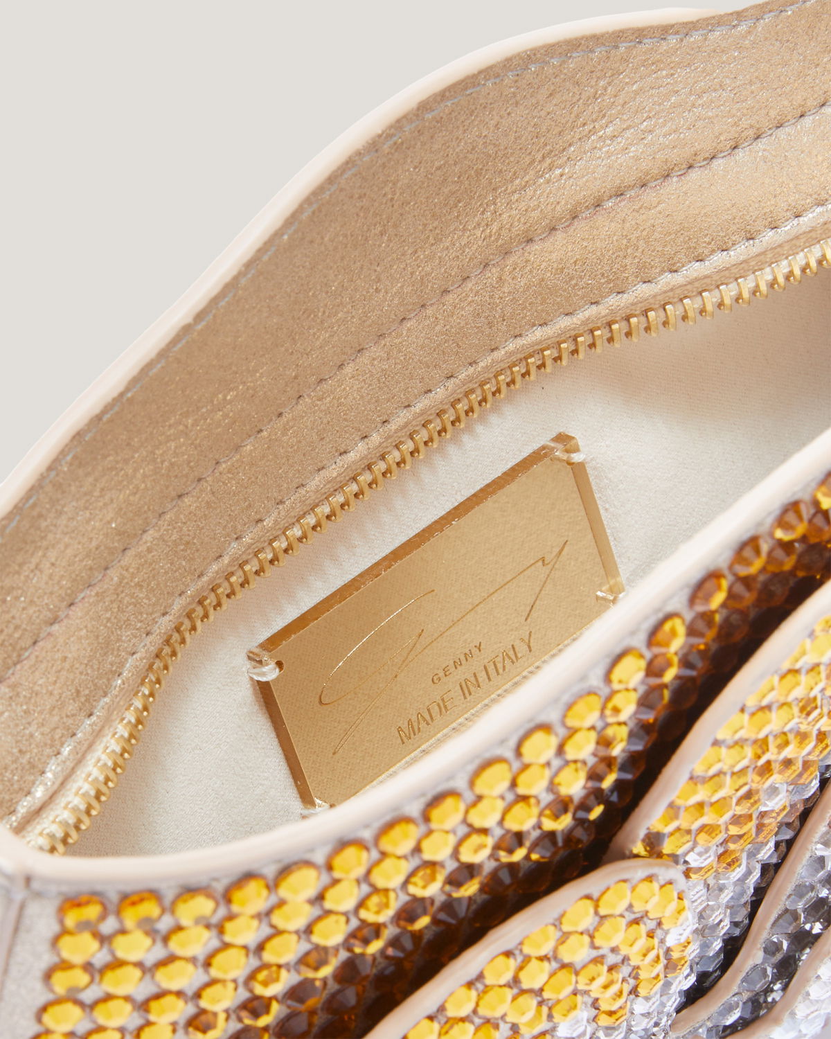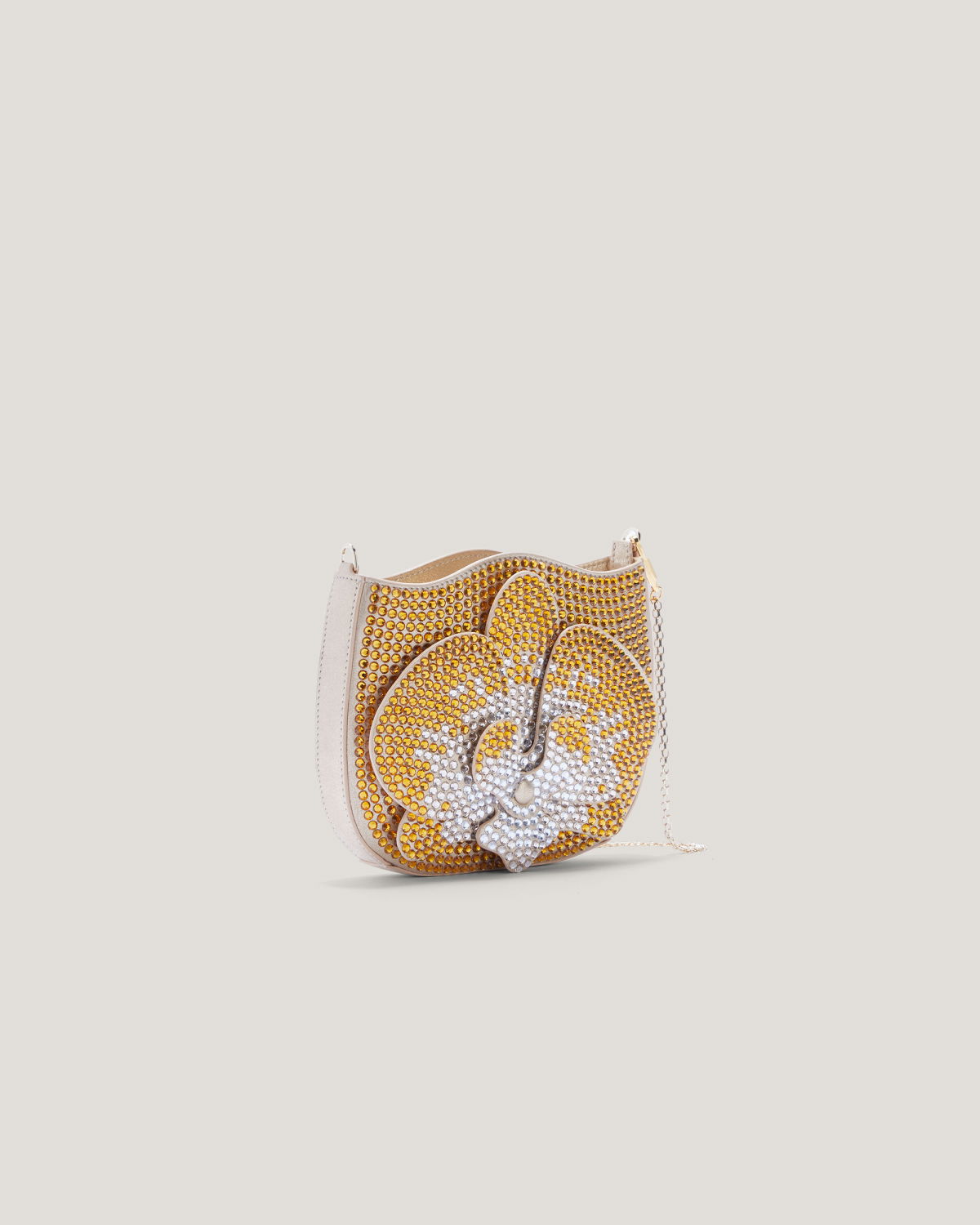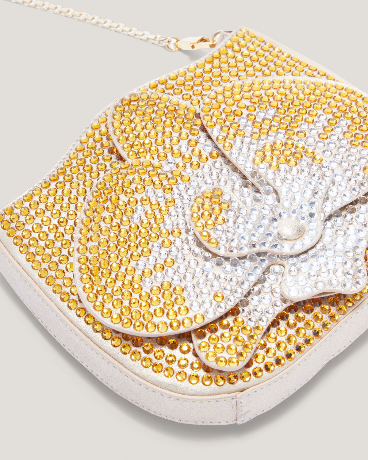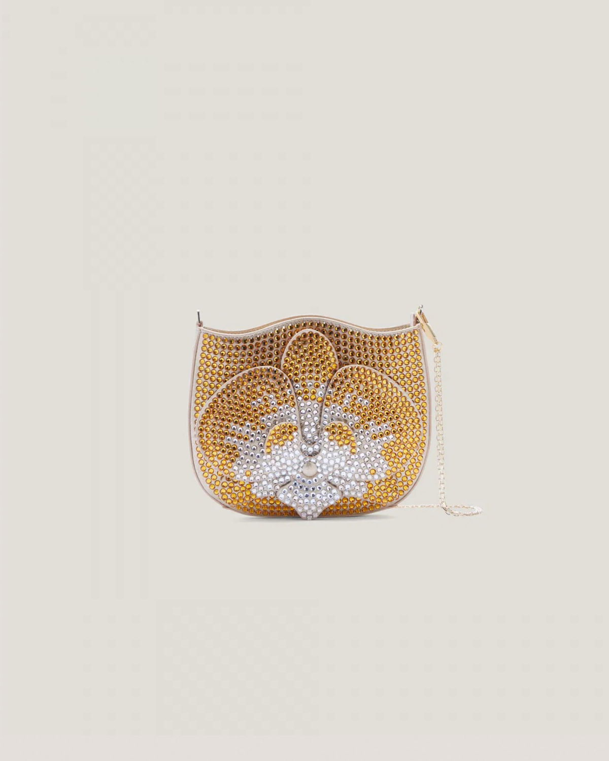 It is adorned with rhinestones that create a luminous effect on both sides, and features a three-dimensional orchid, embellished with rhinestones on the front, adding a touch of elegance and femininity. The strap is detachable and adjustable, offering versatility in how you use the bag.