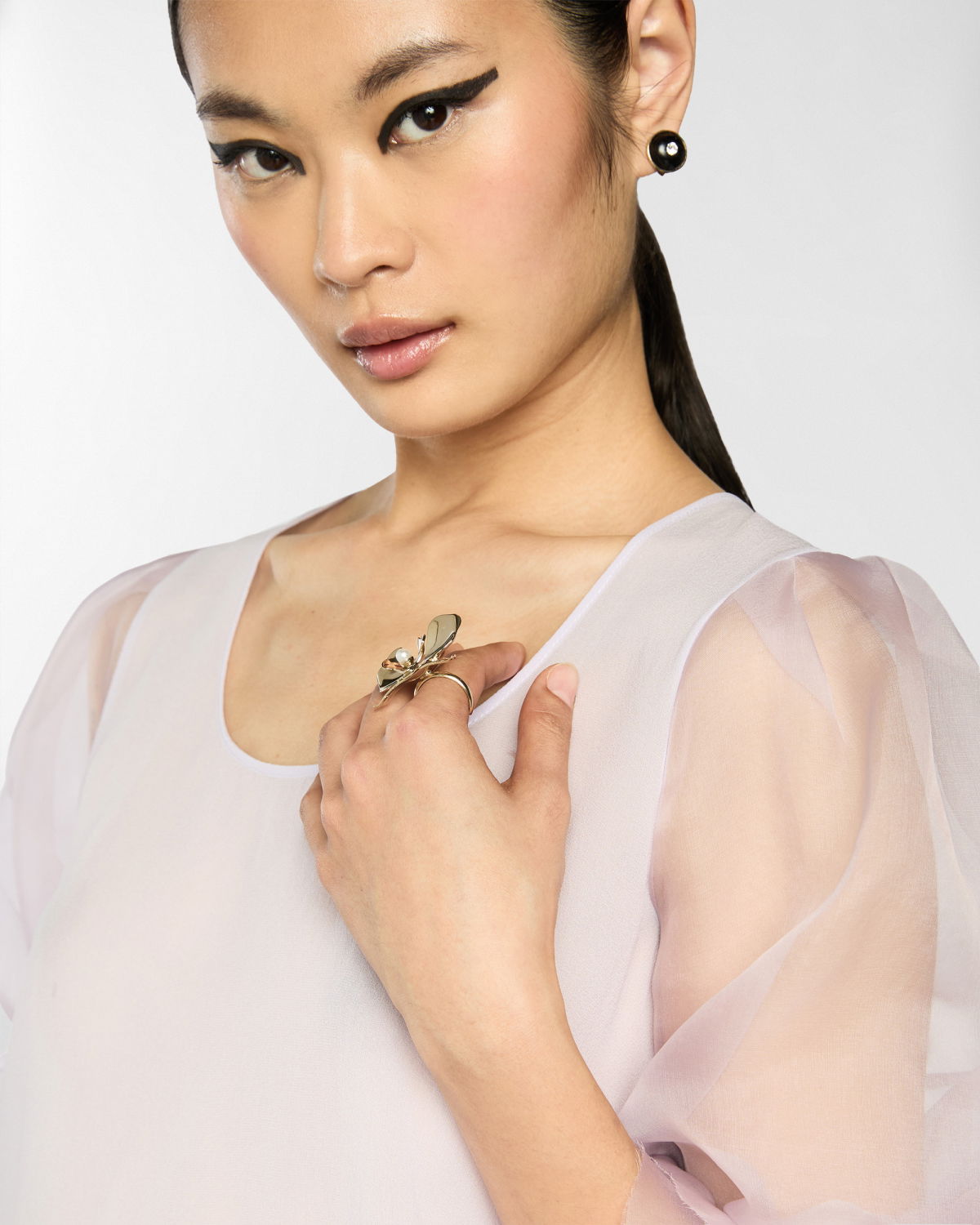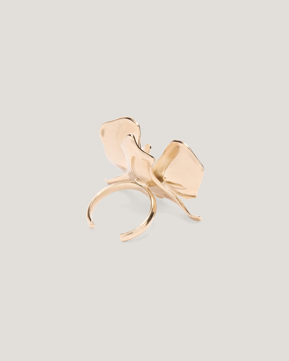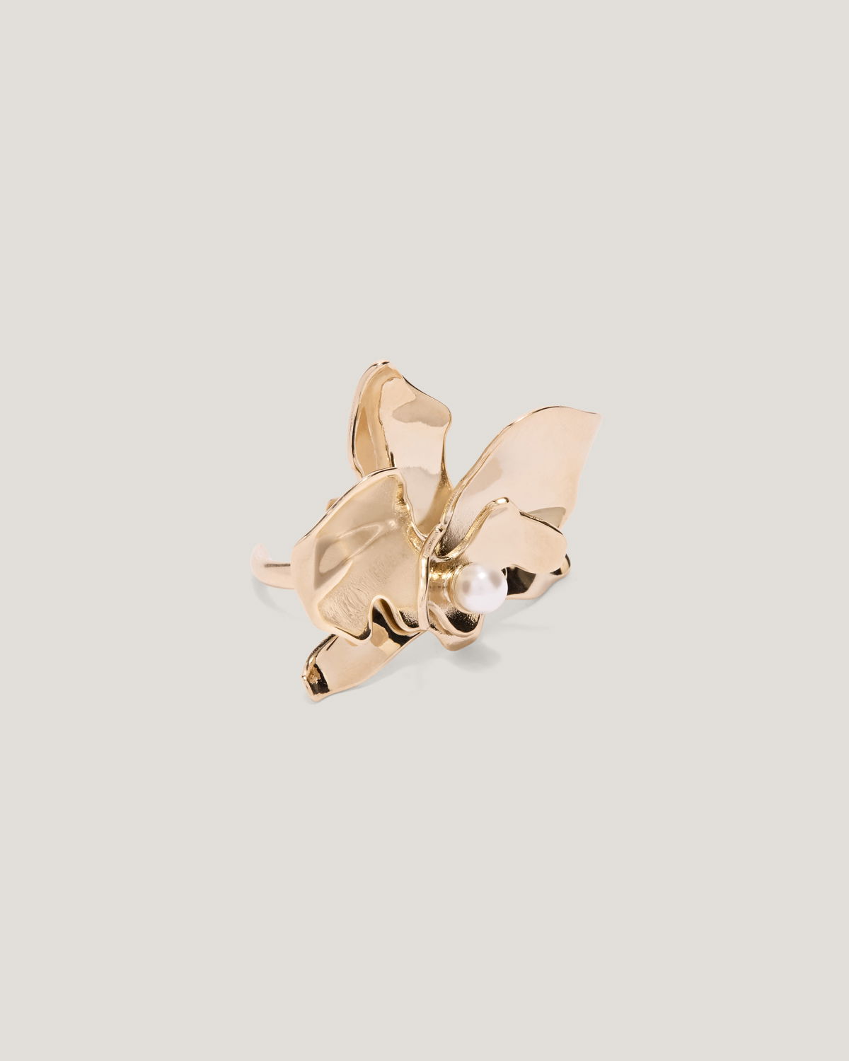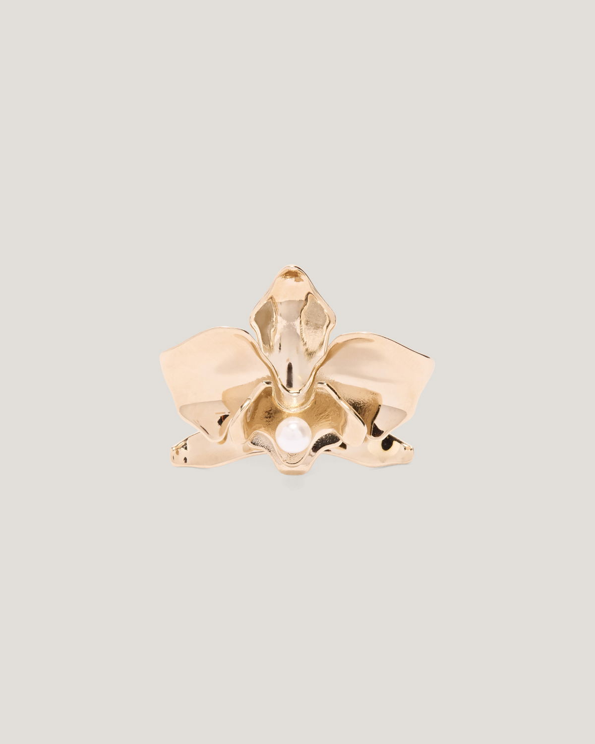 Elegant ring entirely Made in Italy, crafted in gold-tone metal, featuring a refined three-dimensional orchid and a white resin pearl at its center. A sophisticated accessory and a distinctive symbol of the maison, perfect for adding a touch of elegance to any look.