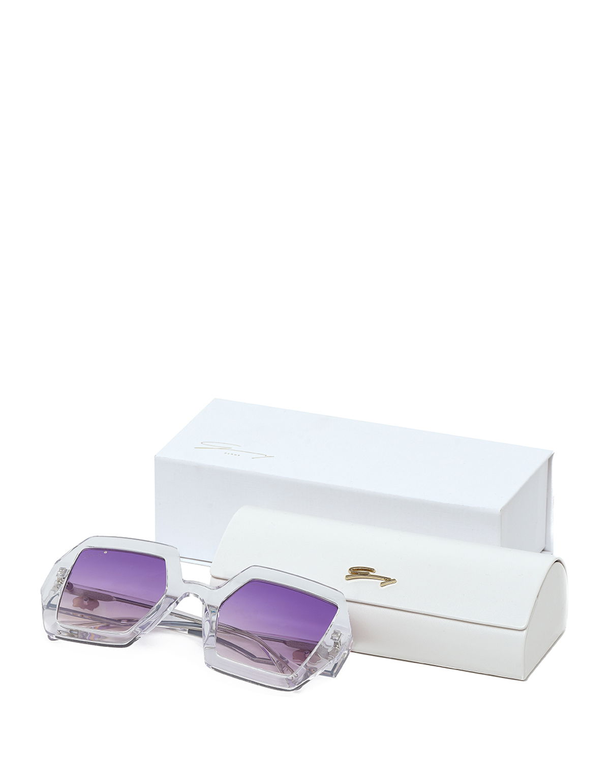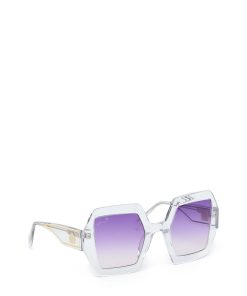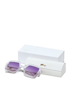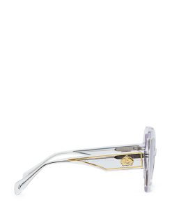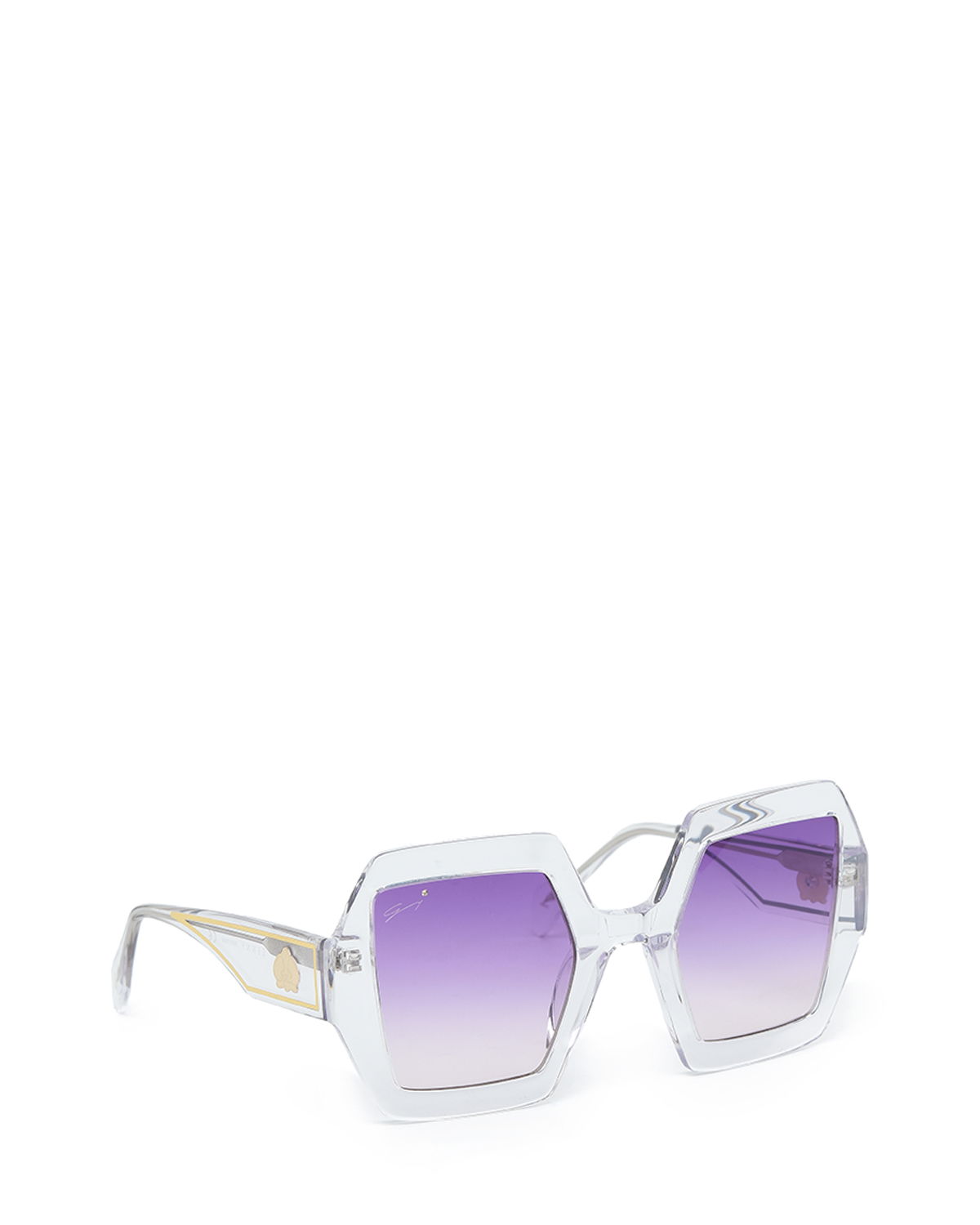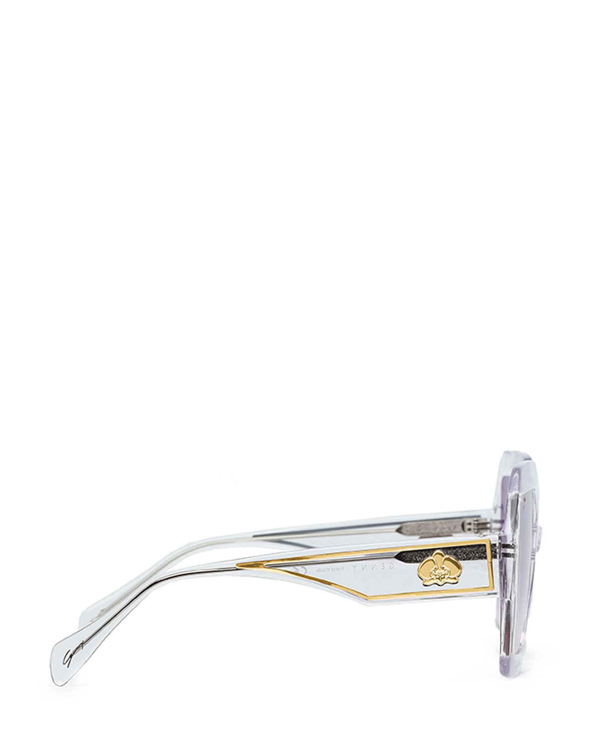 With their feminine and easy-to-wear style, the square sunglasses are great to pair with any look. The temples start with Genny orchid symbol that gives this piece an iconic twist. Moreover, the temples are surrounded by an elegant golden profile. The lenses gradually change colour from blue to white. Golden Genny logo completes the temple tips.