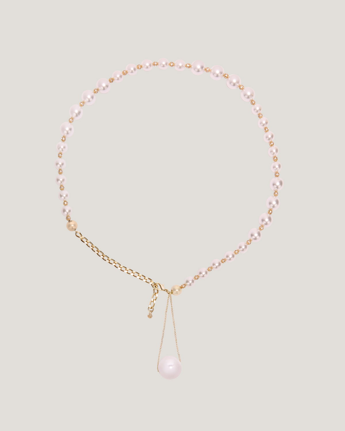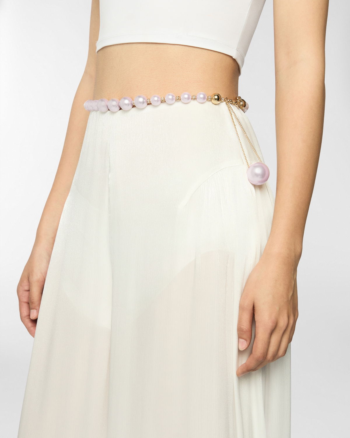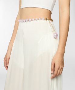 A timeless accessory, this belt features resin pearls and gold-tone metal details. Its delicate chain and central pearl charm add a touch of elegance and sophistication to any outfit.