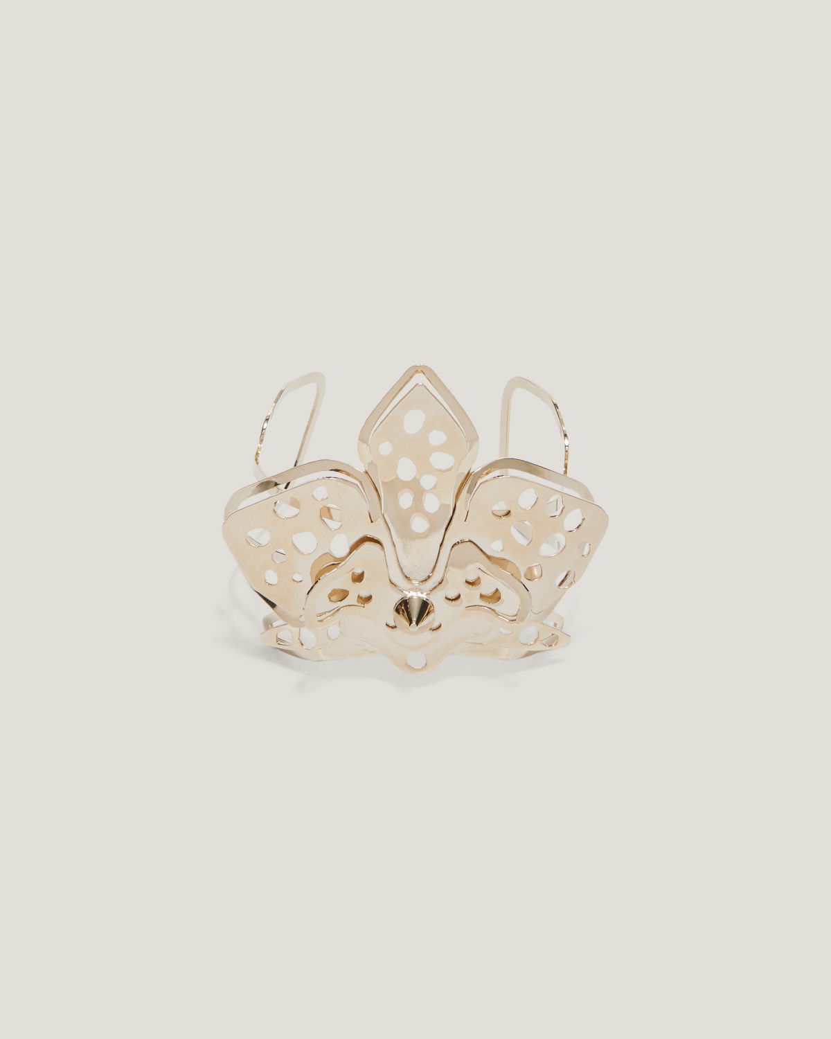 The maxi bracelet features an intricate design with a three-layered perforated orchid for a three-dimensional effect. The petals are meticulously handcrafted for precise folding.
