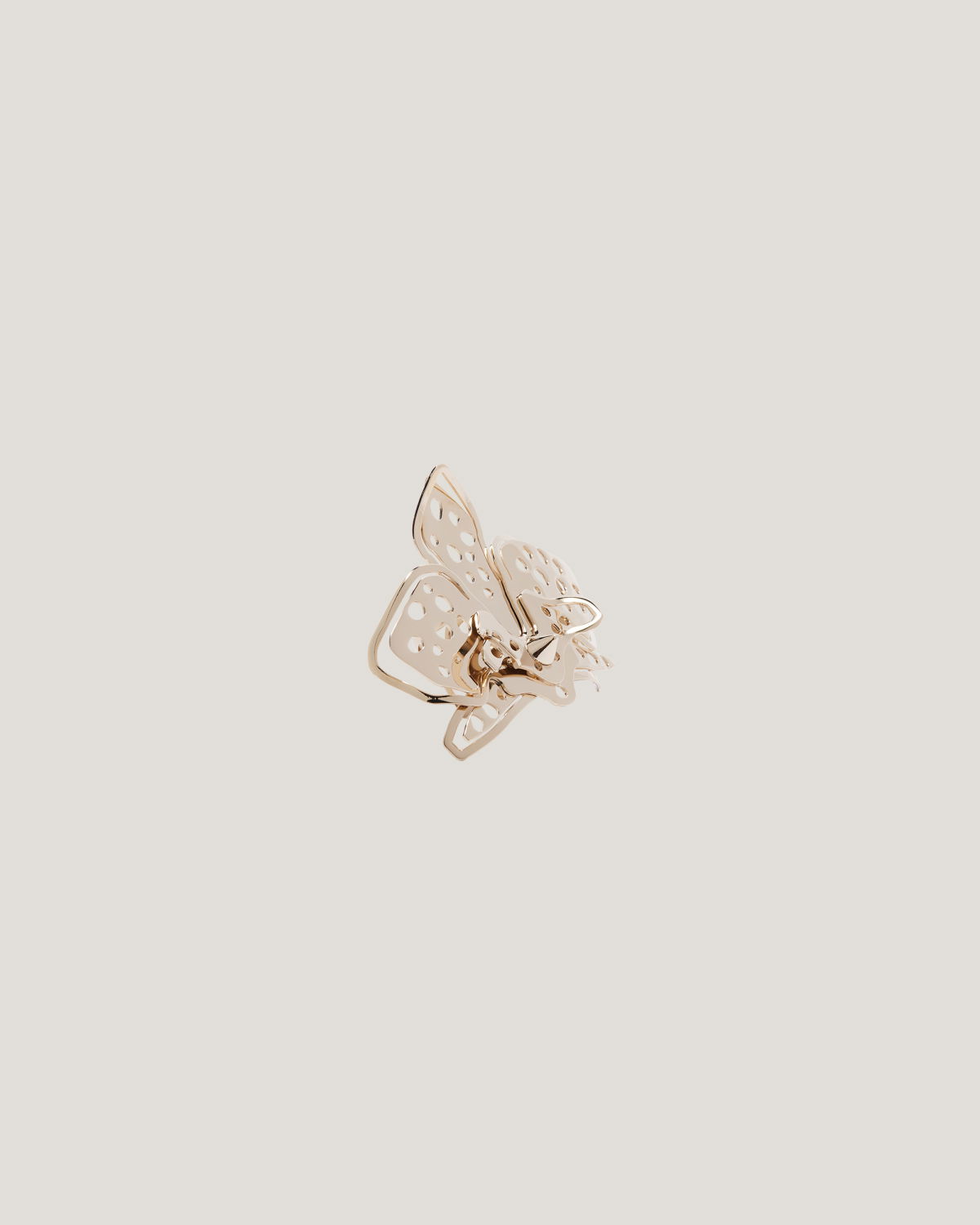 The maxi ring features an intricate design with a three-layered perforated orchid for a three-dimensional effect. The petals are meticulously handcrafted for precise folding.
