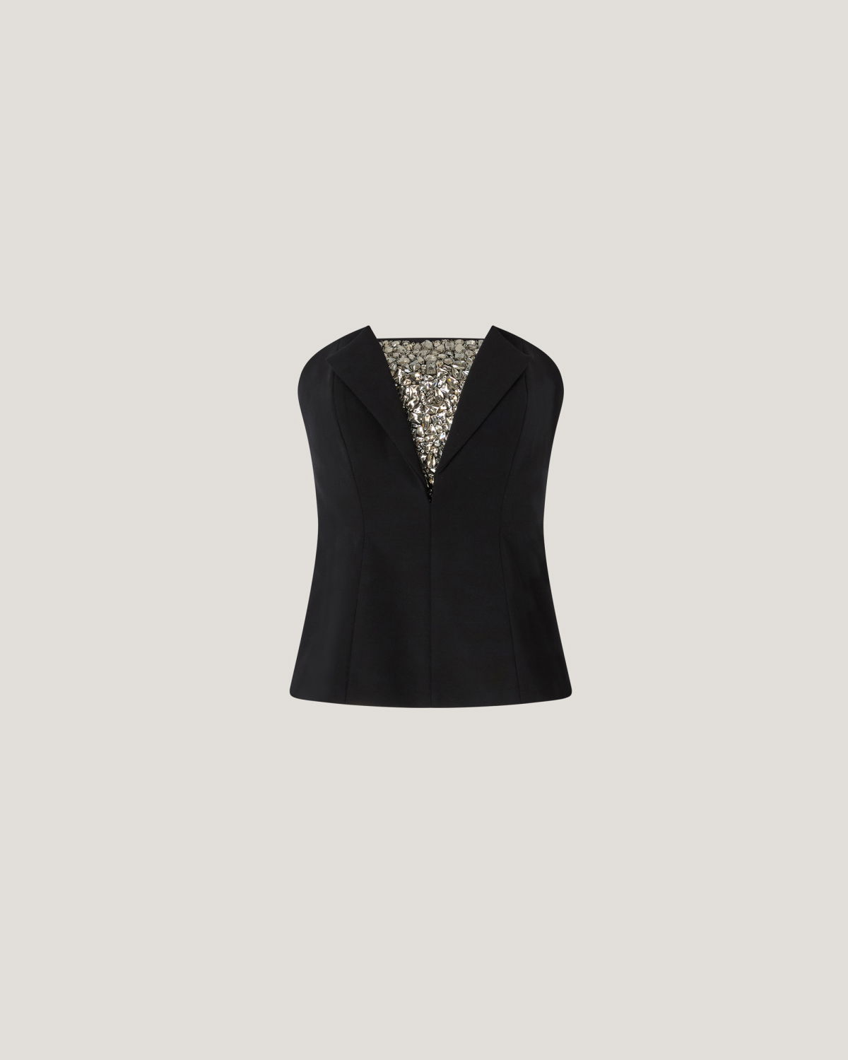 This bustier blends a fitted, tailored silhouette with bold femininity. The sweetheart neckline opens onto a jewel embroidery of multifaceted rhinestones, adding both sensuality and light.