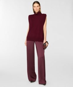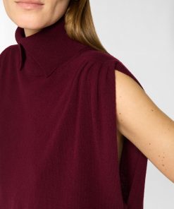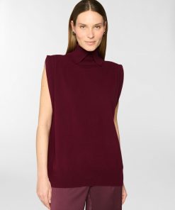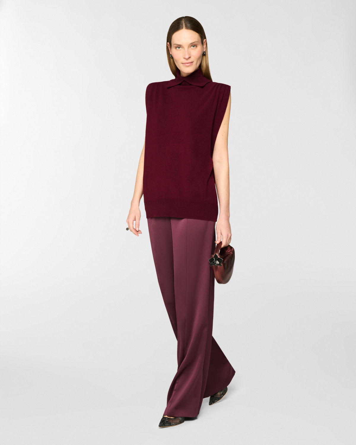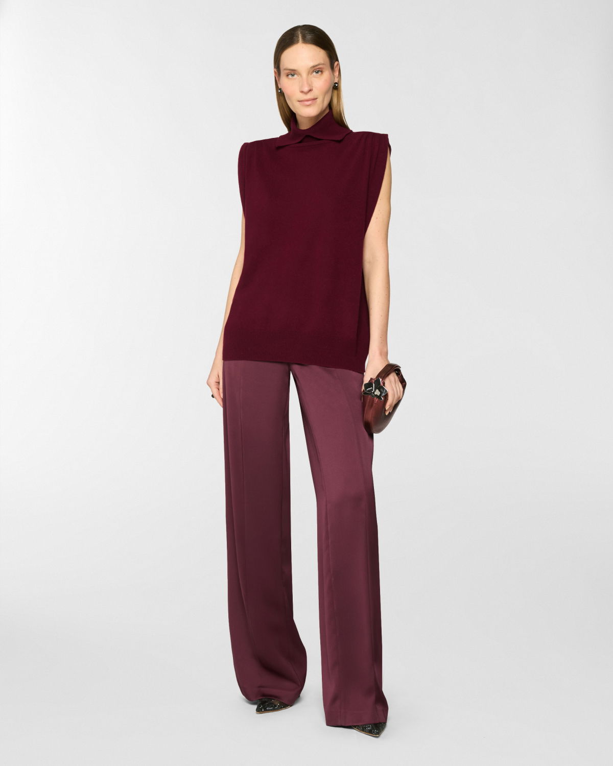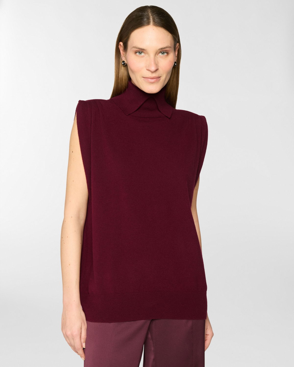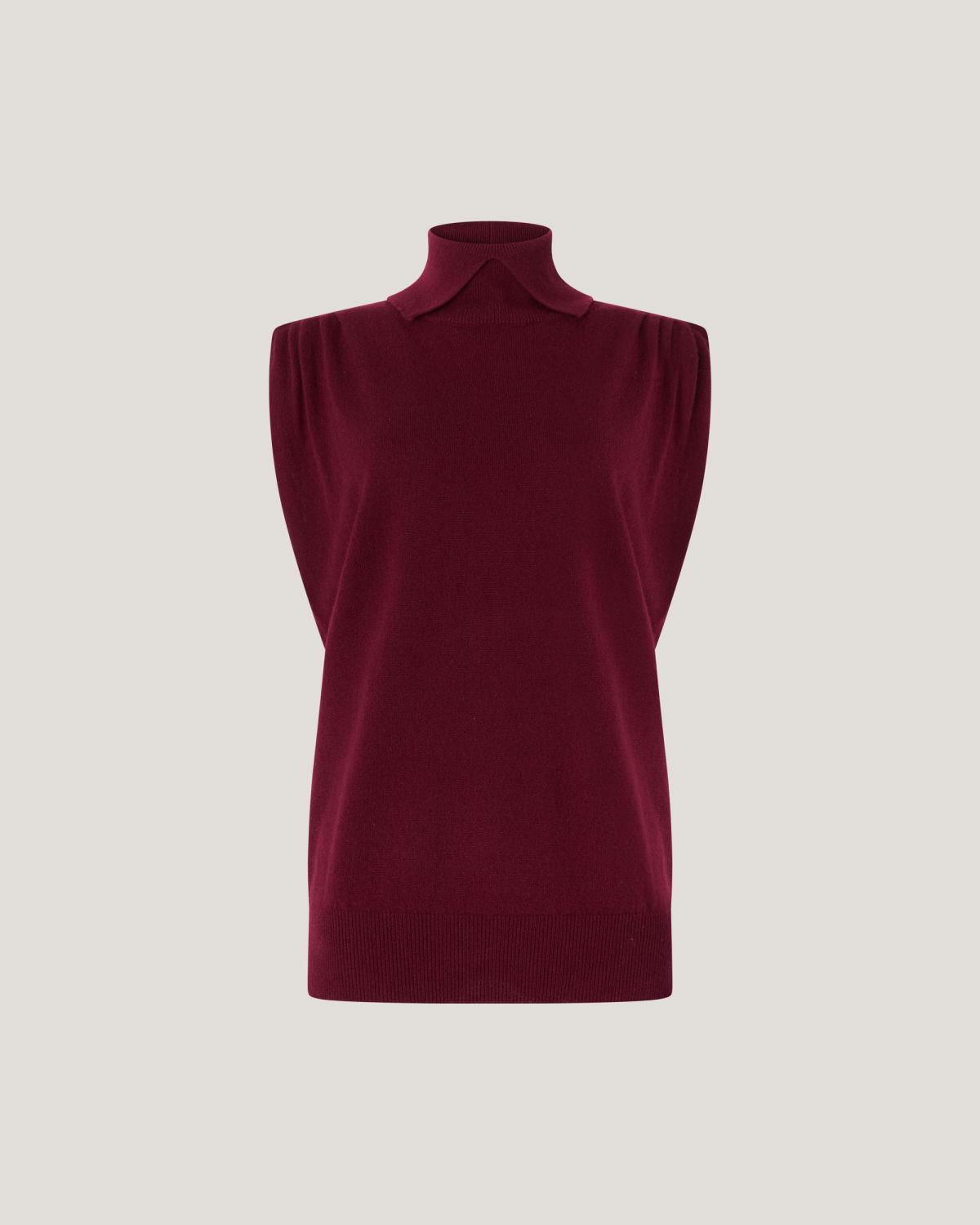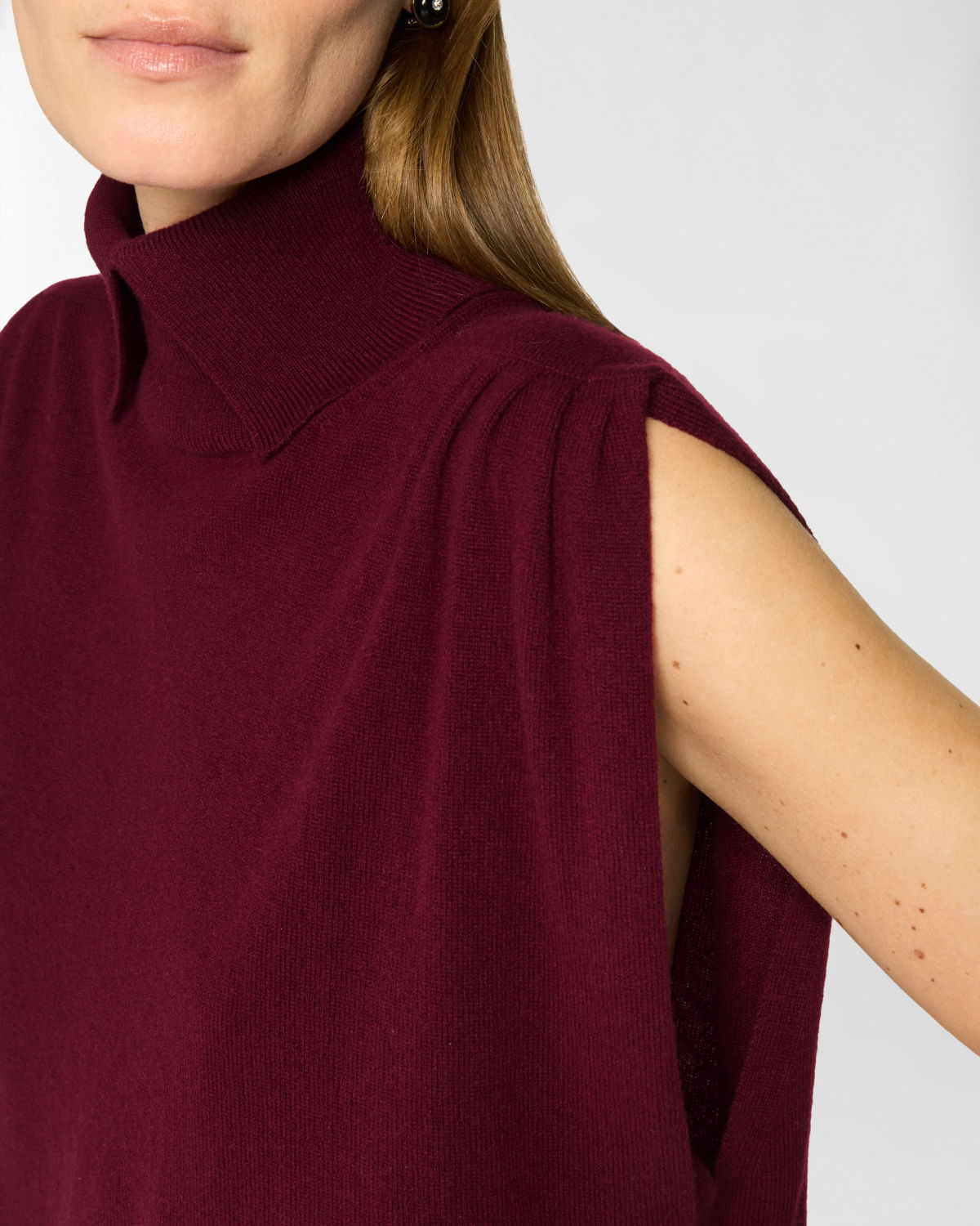 This sleeveless top is crafted from ultra-fine cashmere with a featherlight, ethereal texture. The open-front turtleneck and subtle gathers at the shoulders add volume and delicacy. With its fluid fit and hip-length cut, it’s ideal worn alone or layered under a blazer for a refined touch. At the lower front, a tone-on-tone orchid embroidery adds a refined touch.