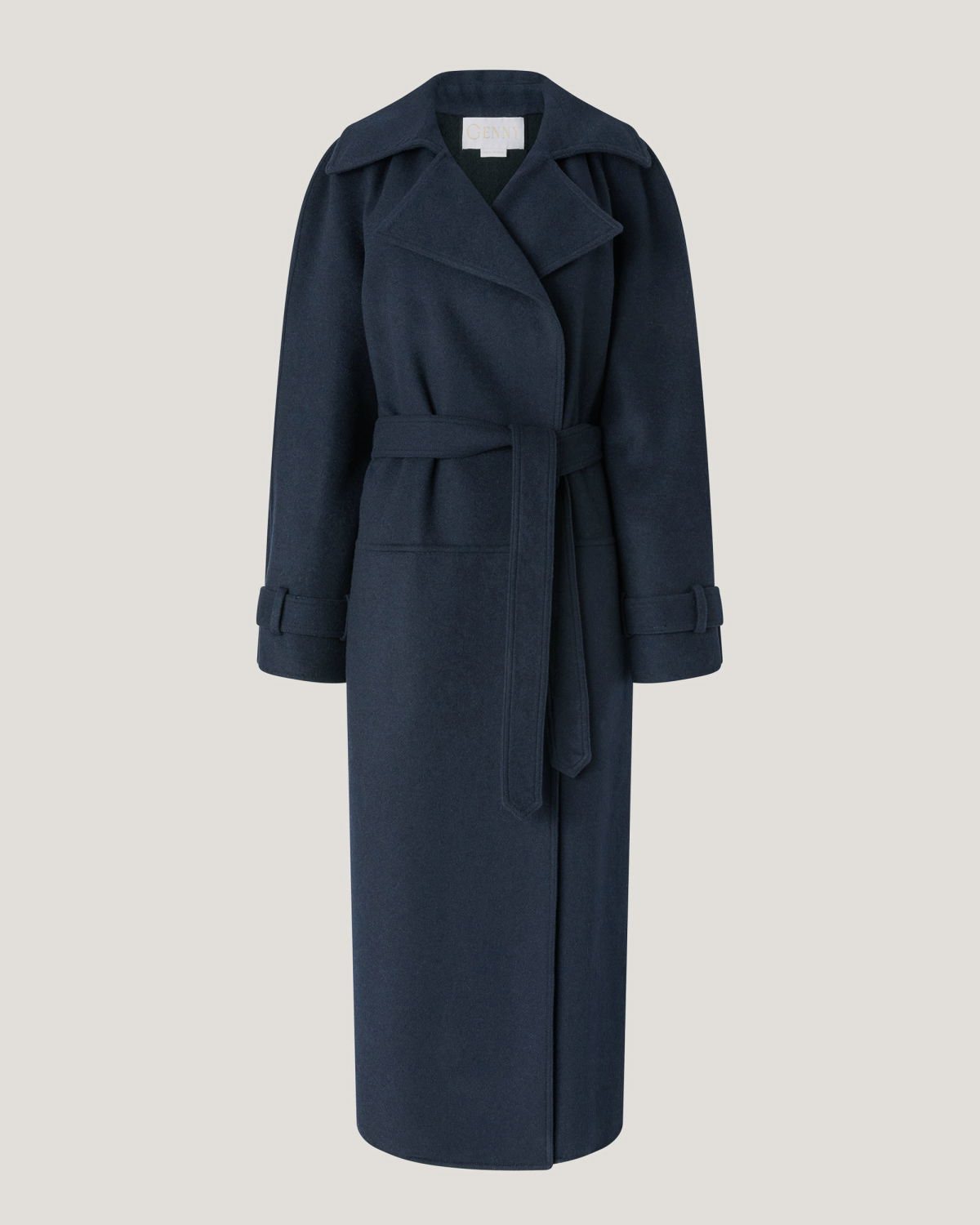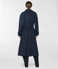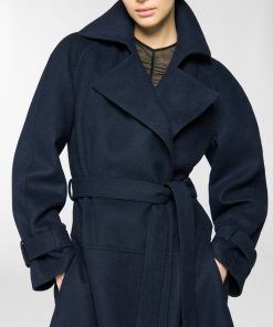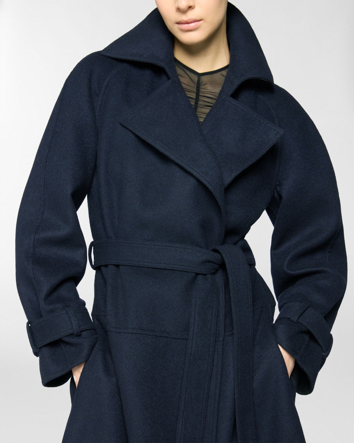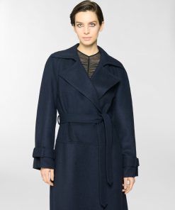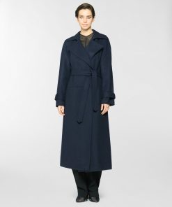 Long trench coat featuring an elegant waist belt and tailored details such as strap cuffs. The silhouette is fluid, with classic lapels and softly structured sleeves. Made from a wool and cashmere blend, it boasts a velvety texture that offers both structure and comfort. Perfect for completing cold-season looks with effortless elegance.