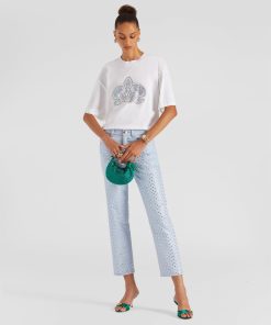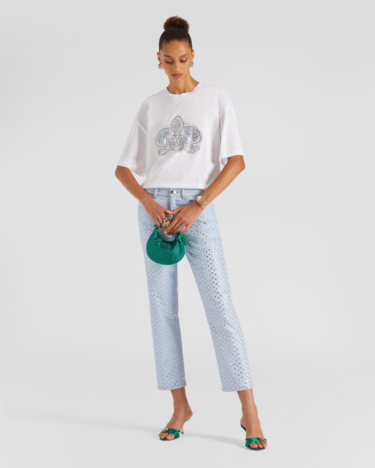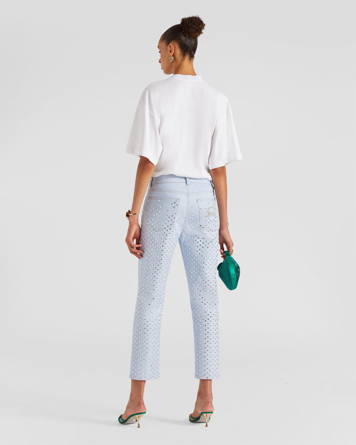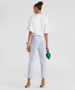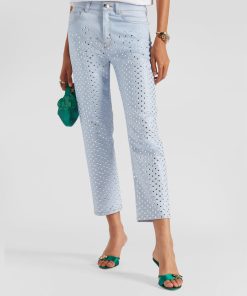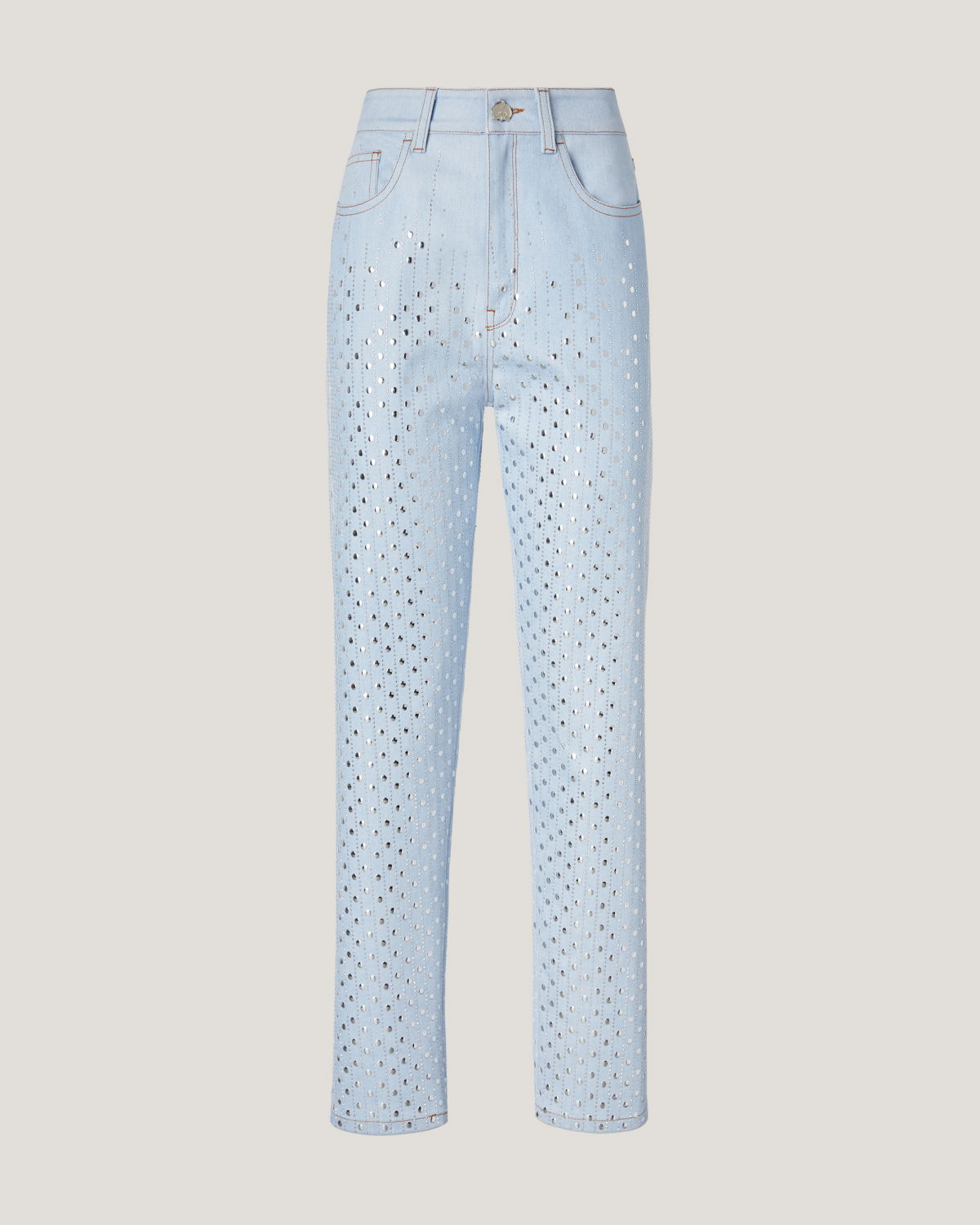 With a regular waist and straight leg, they offer unparalleled comfort and a fit suitable for various occasions. Their ankle-length makes them versatile, perfect for work or leisure. What truly sets them apart is the addition of rhinestones that adorn the entire length of the pants, adding a touch of brilliance and luxury.