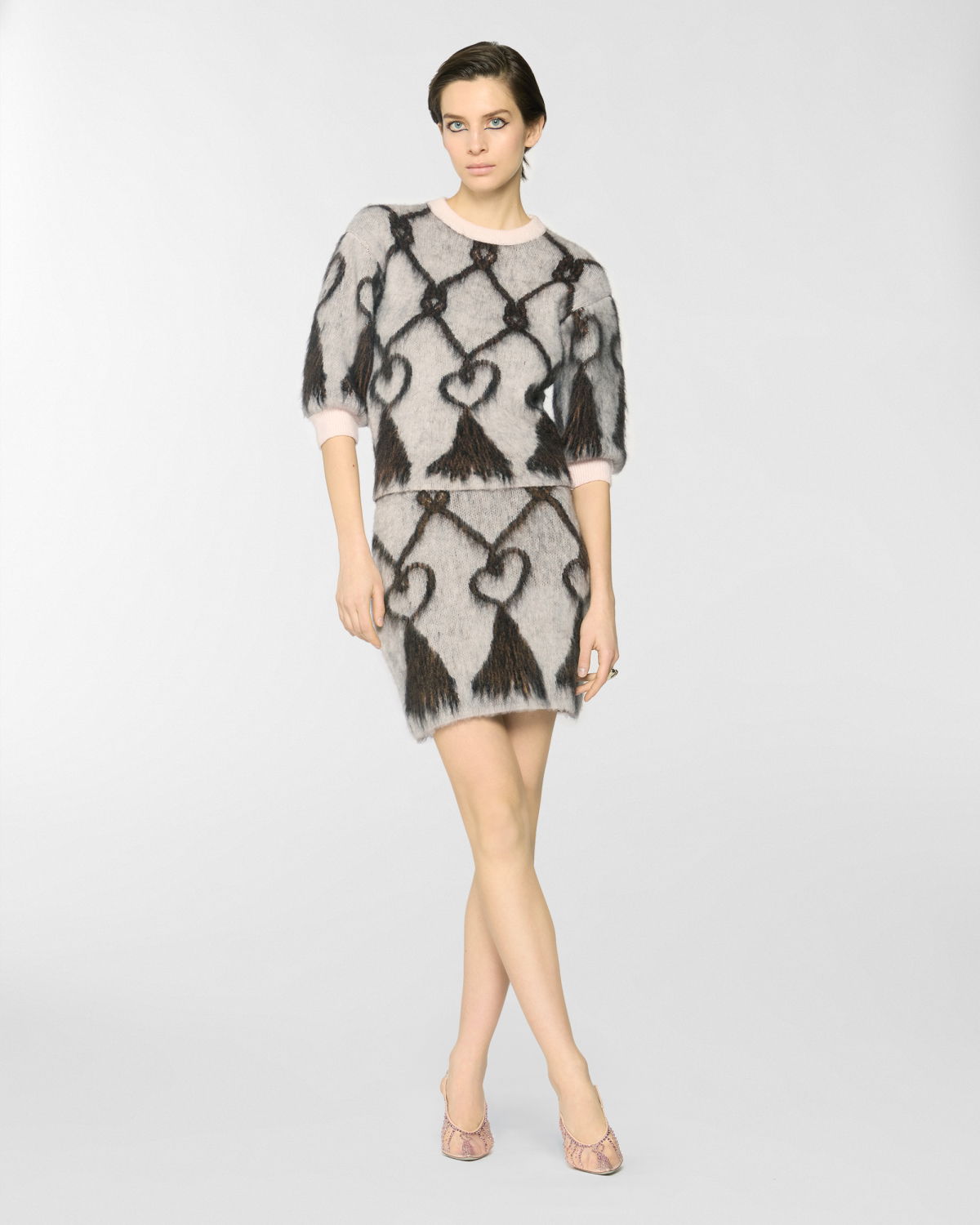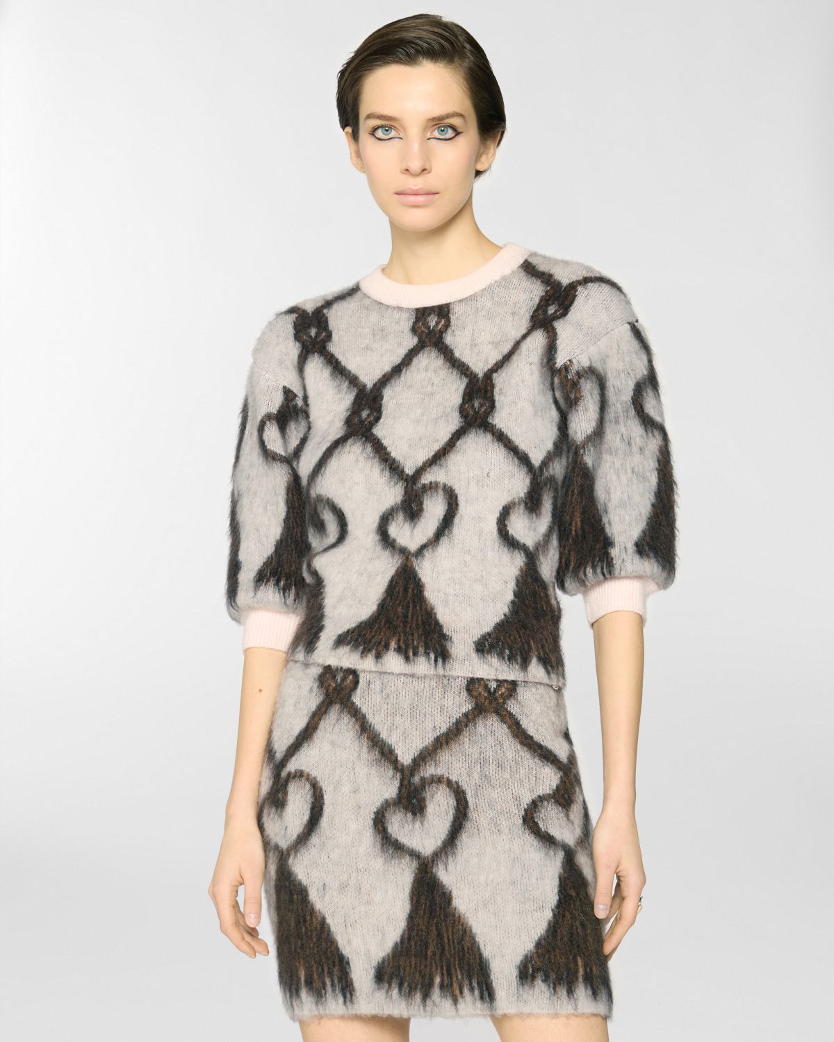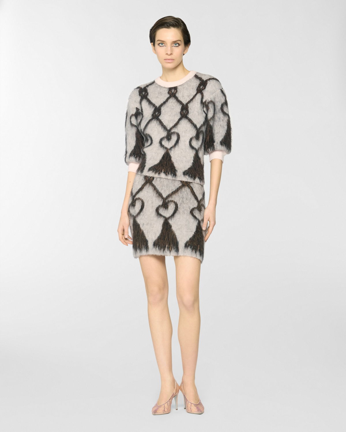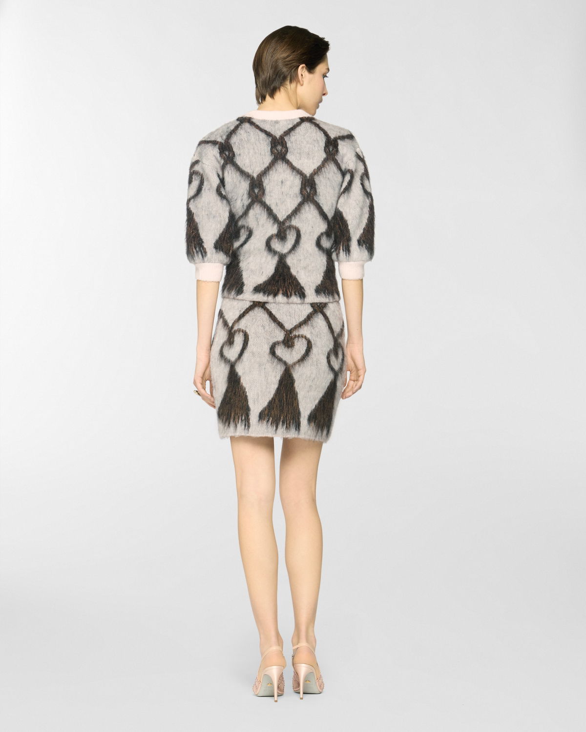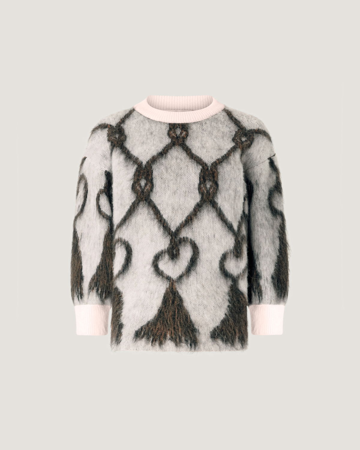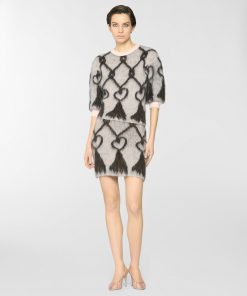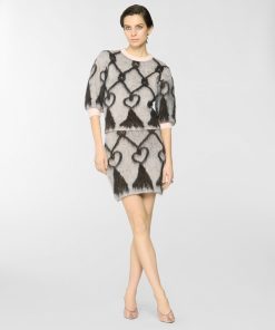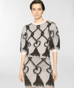 This crew-neck pullover features a regular fit and hip-grazing length, crafted from pure wool that lends a soft, airy texture. The pattern evokes the effect of tassels, reinterpreting a vintage symbol of the Maison. Sleeves that fall above the elbow add a modern touch to a piece that blends comfort and style.