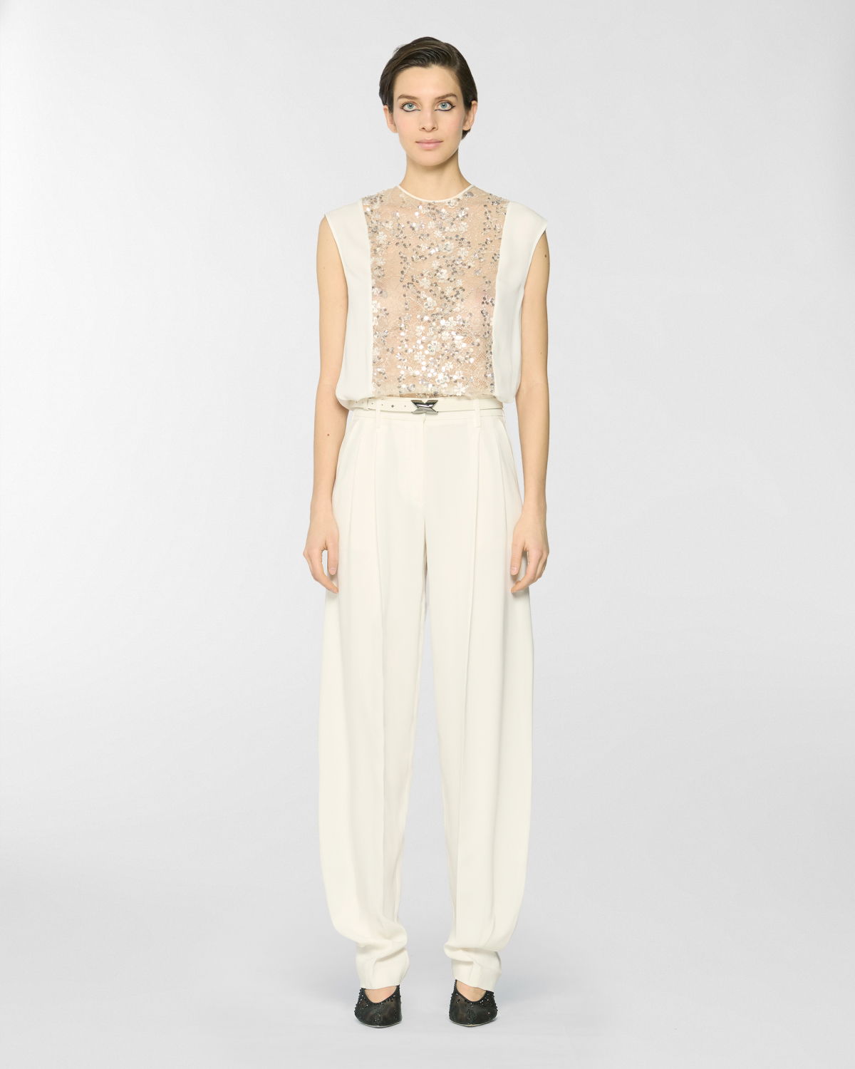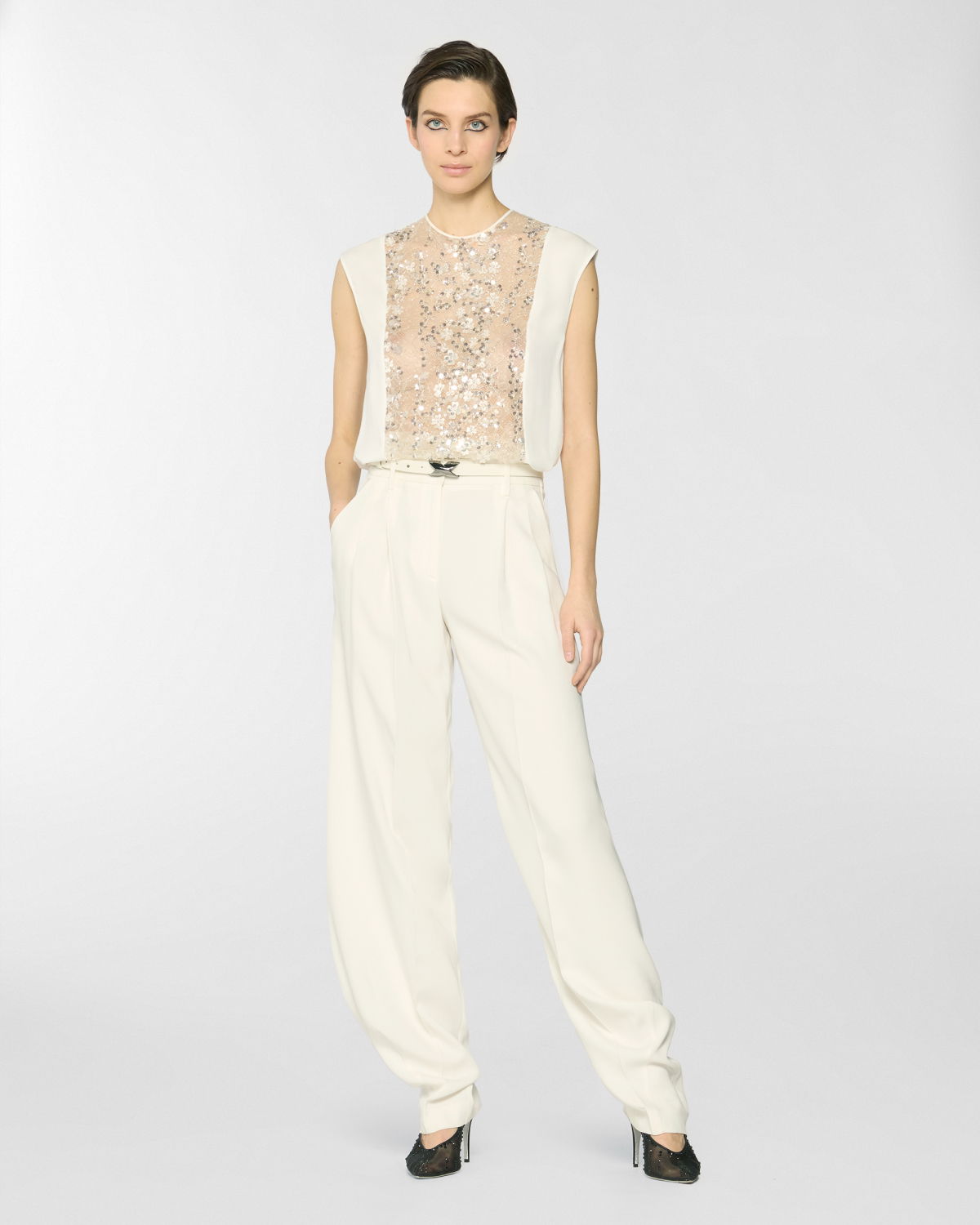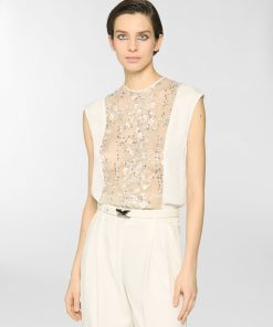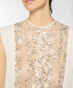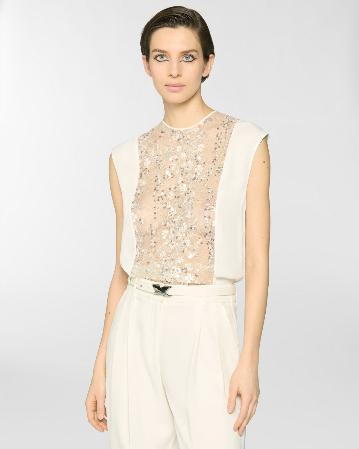 This sleeveless crew-neck top features a central panel in embroidered lace. Three-dimensional flowers, sequins, and beads create a delicate play of light. A straight cut and keyhole closure at the back complete the design.