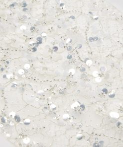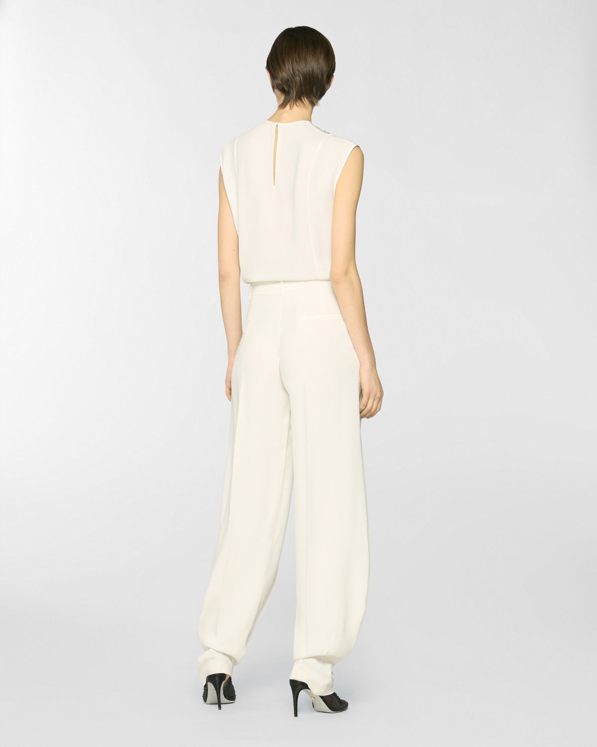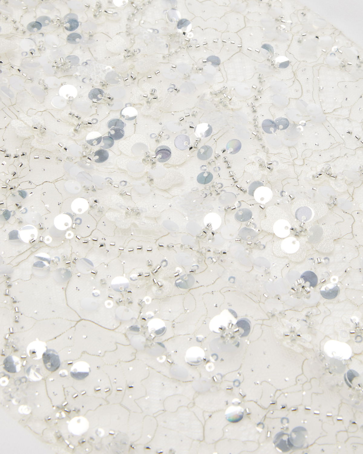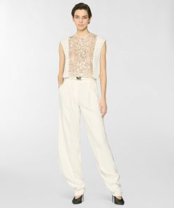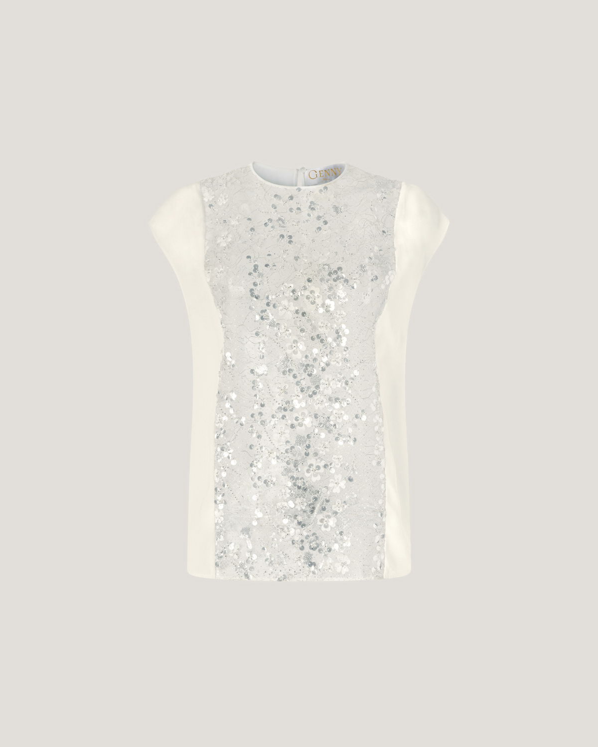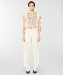 This sleeveless crew-neck top features a central panel in embroidered lace. Three-dimensional flowers, sequins, and beads create a delicate play of light. A straight cut and keyhole closure at the back complete the design.