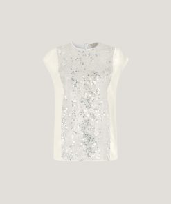 This sleeveless crew-neck top features a central panel in embroidered lace. Three-dimensional flowers, sequins, and beads create a delicate play of light. A straight cut and keyhole closure at the back complete the design.