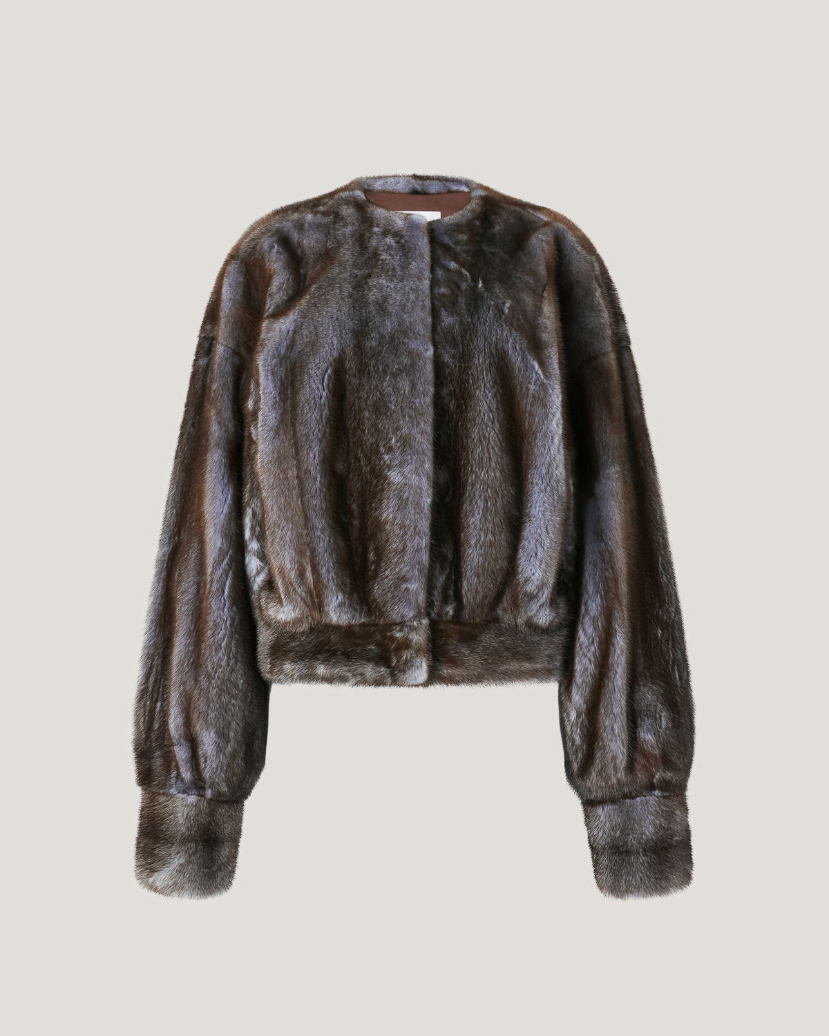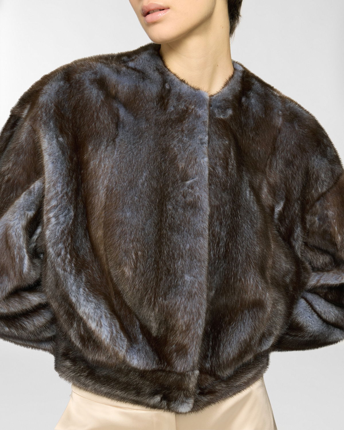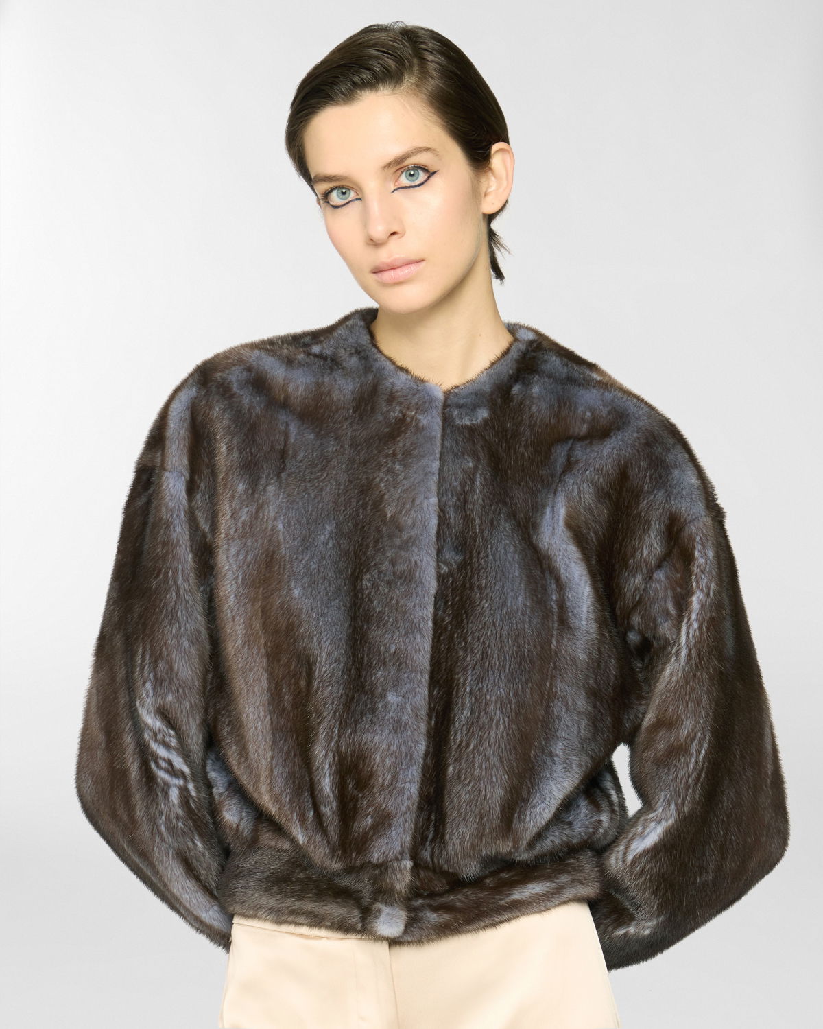Mink fur outerwear featuring a soft silhouette, long voluminous sleeves, a clean crew neckline, and elasticated details at the cuffs and hem that gently define the waist. A versatile piece, perfect for both everyday looks and elegant evening ensembles.