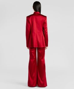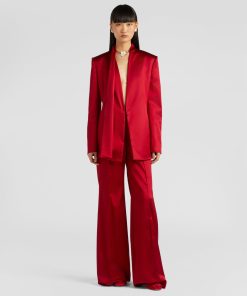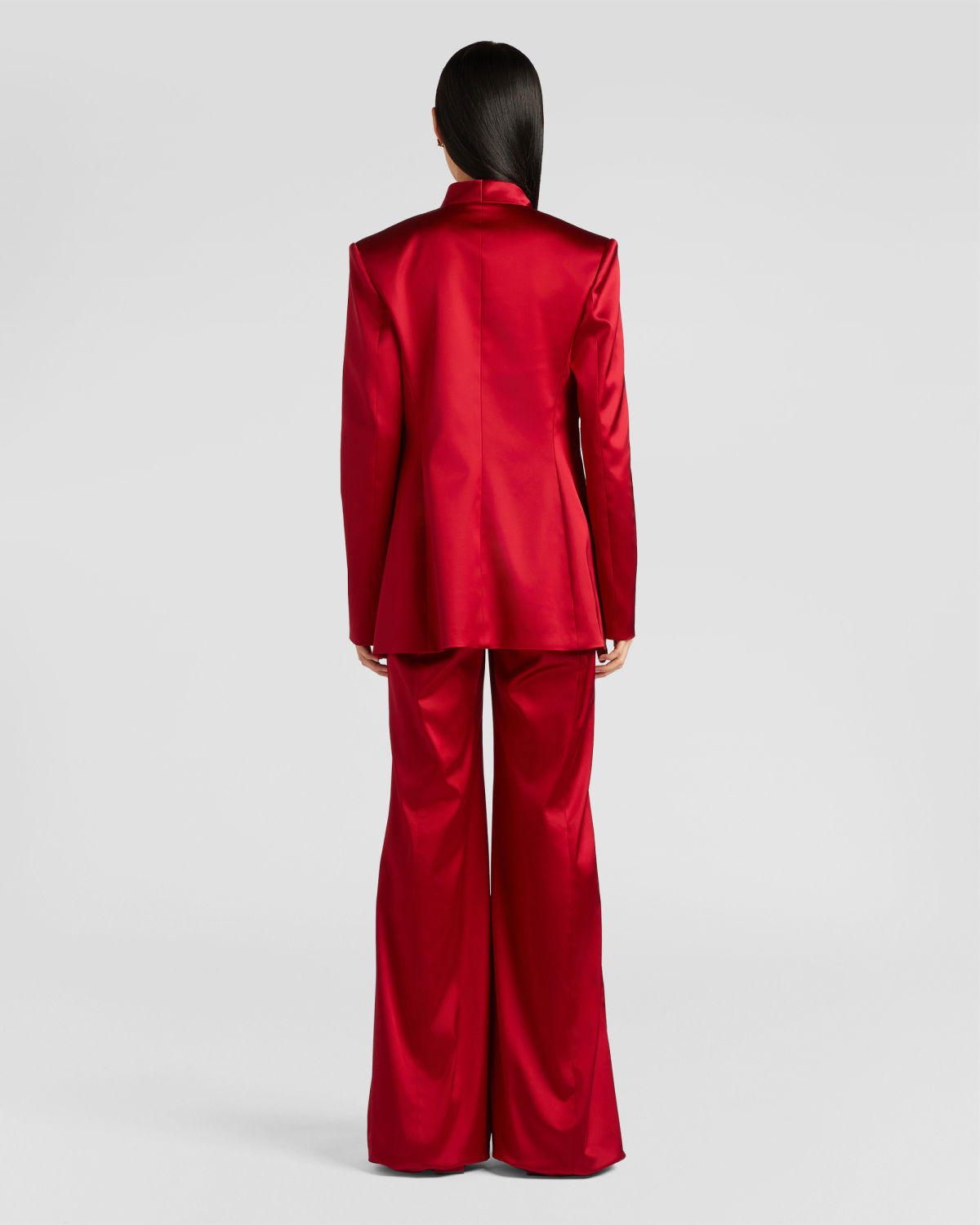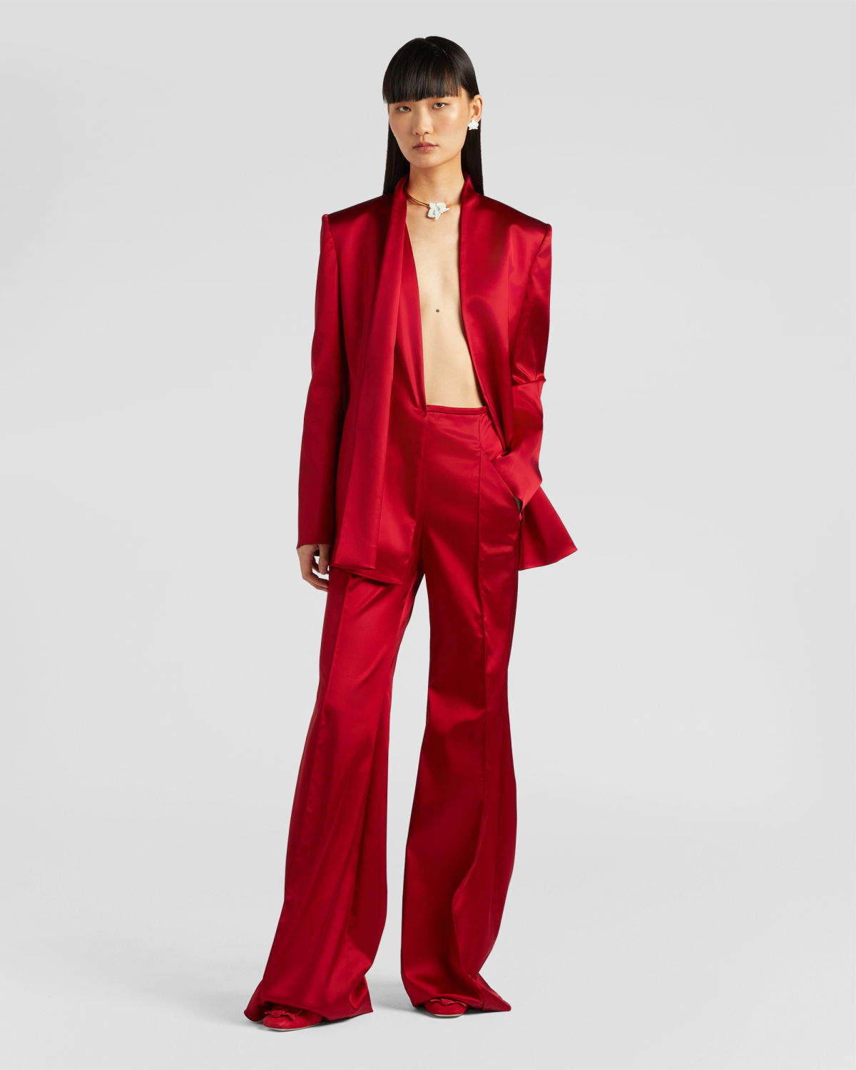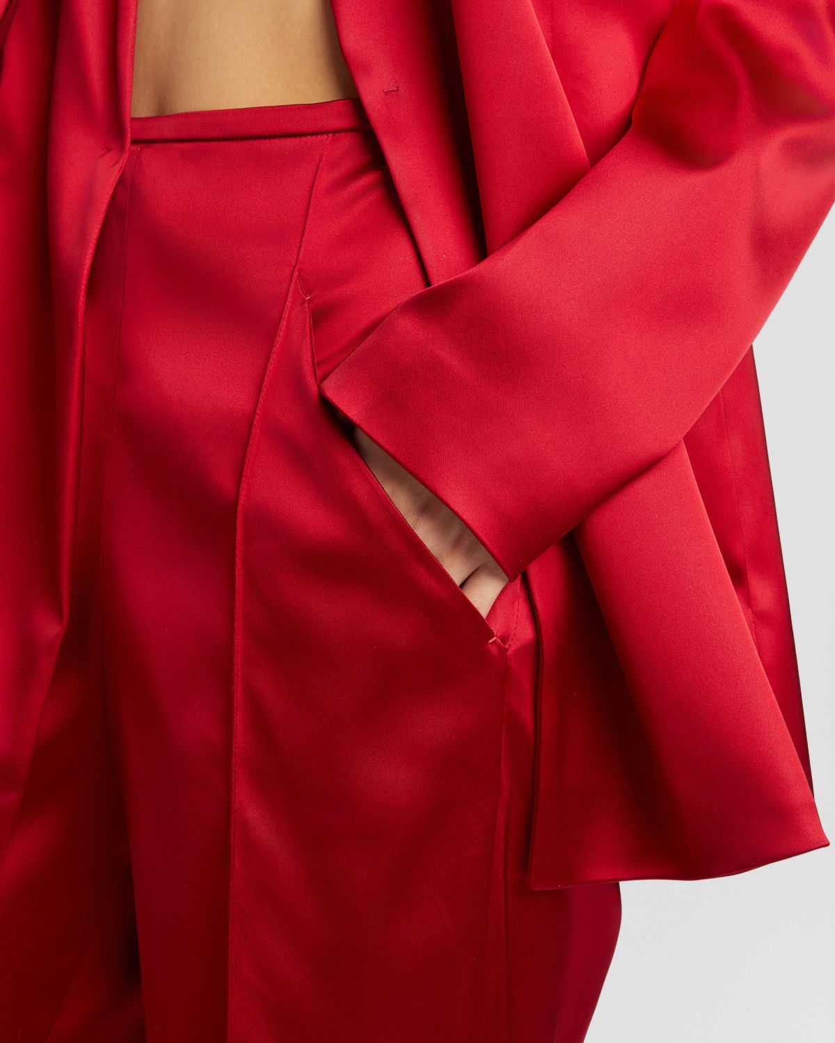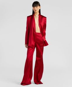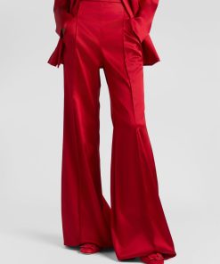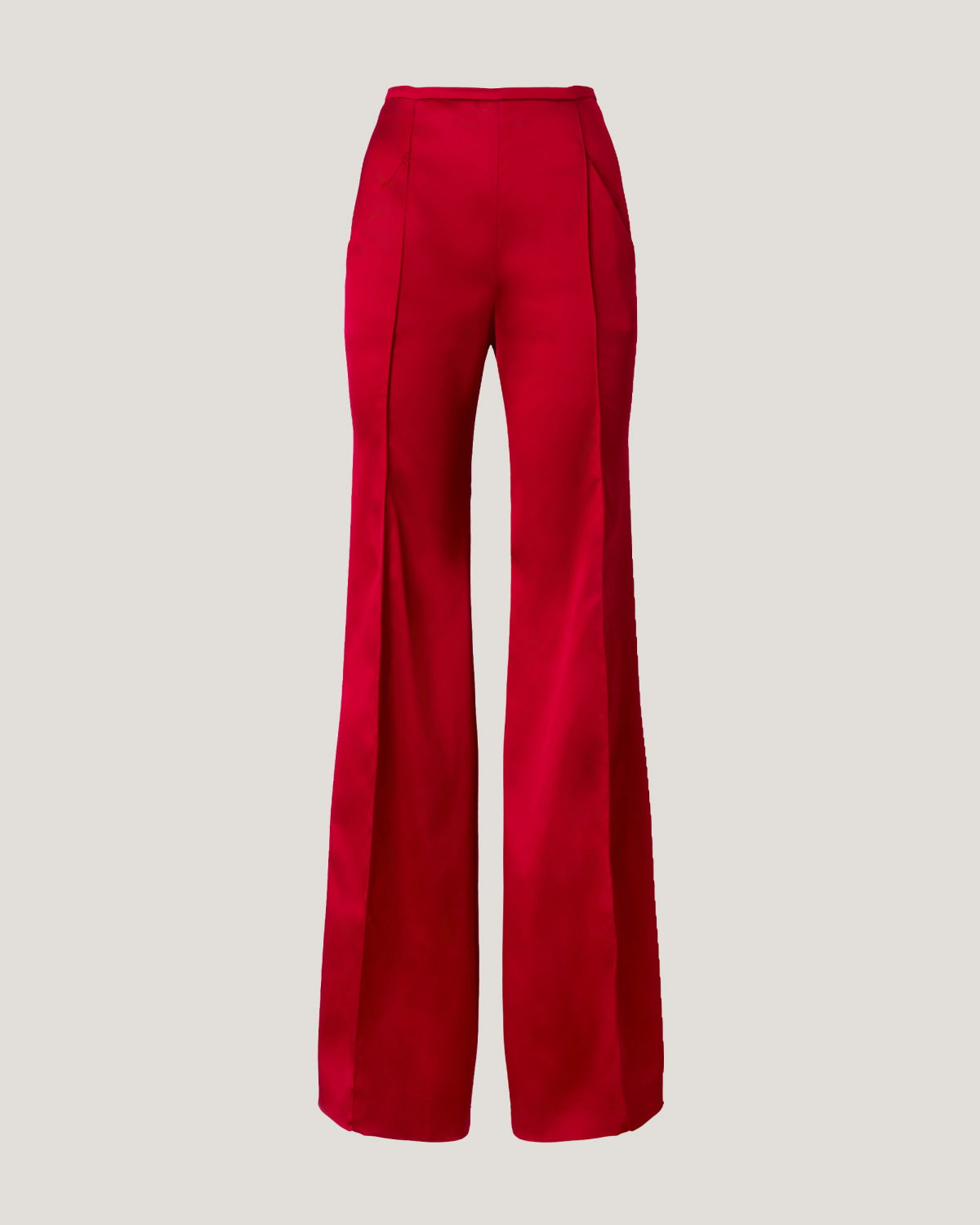 Discover modern elegance with these flared satin pants, crafted from super stretch fabric that reflects the light with every step for a luminous and sophisticated effect. The high waist with a slim waistband and hidden closure sculpts the silhouette, ensuring a flawless fit. Front cut and pleat details add a touch of tailored style, turning these pants into an iconic piece with artisanal charm. Side pockets combine functionality and style, making them perfect for those seeking elegance and practicality in one garment.