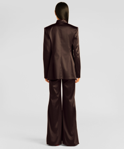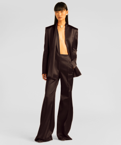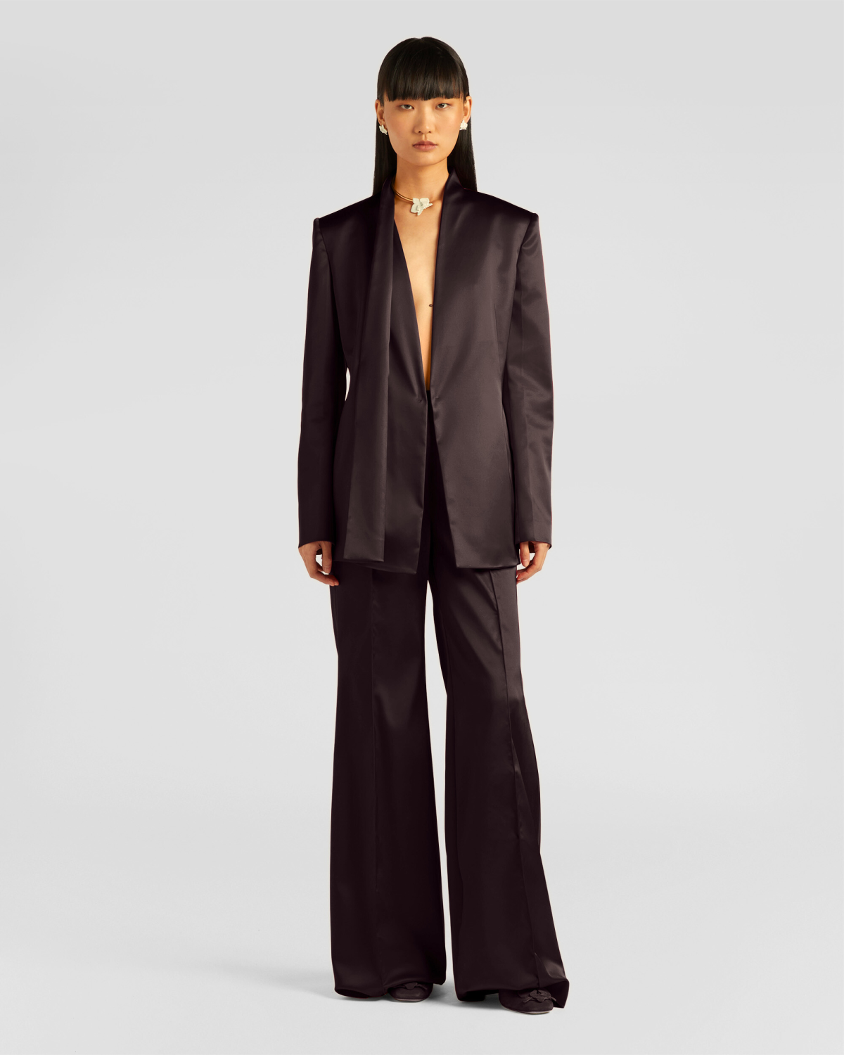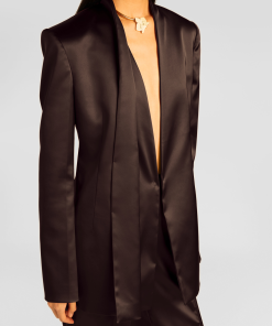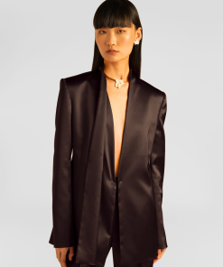 This satin jacket stands out with its asymmetric collar adorned with an elegant scarf-inspired detail. The fitted silhouette enhances the figure, while the long sleeves and hip-length cut add a touch of sophisticated modernity. A masterpiece of style, perfect for those who want to stand out with class and refinement. It pairs perfectly with the matching trousers for an impeccable look.