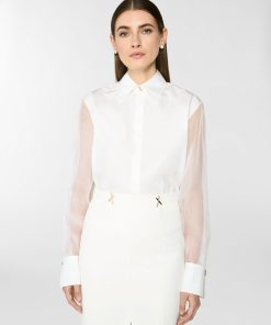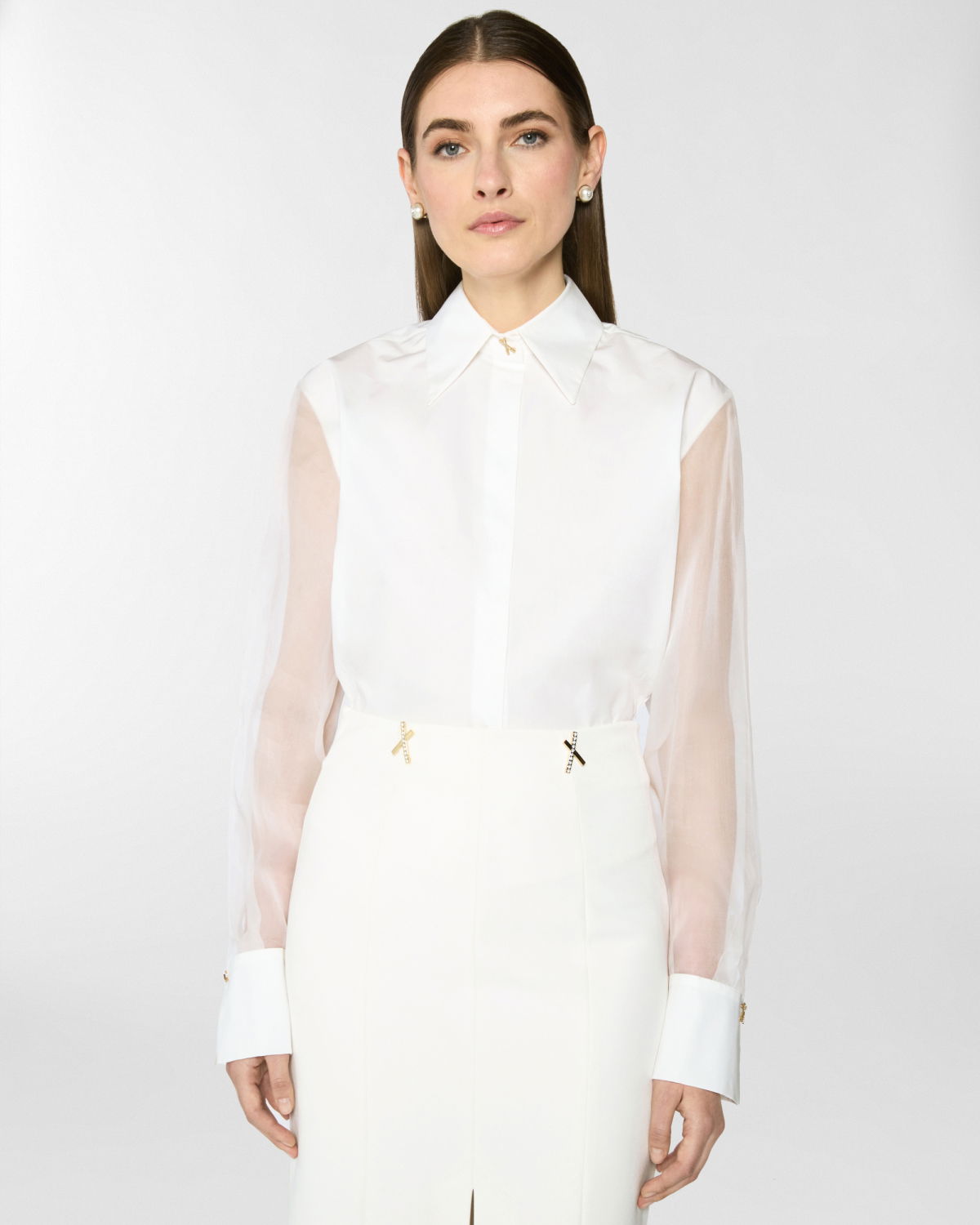 This feminine-cut shirt is crafted from cotton poplin and features long, sheer organza sleeves. The bodice fits close to the body, while the sleeves remain soft and voluminous. A signature “X”-shaped plaque delicately accents the collar and cuffs, adding a subtle touch of light and femininity to the clean design. The waist is gently defined, and the hemline is straight.