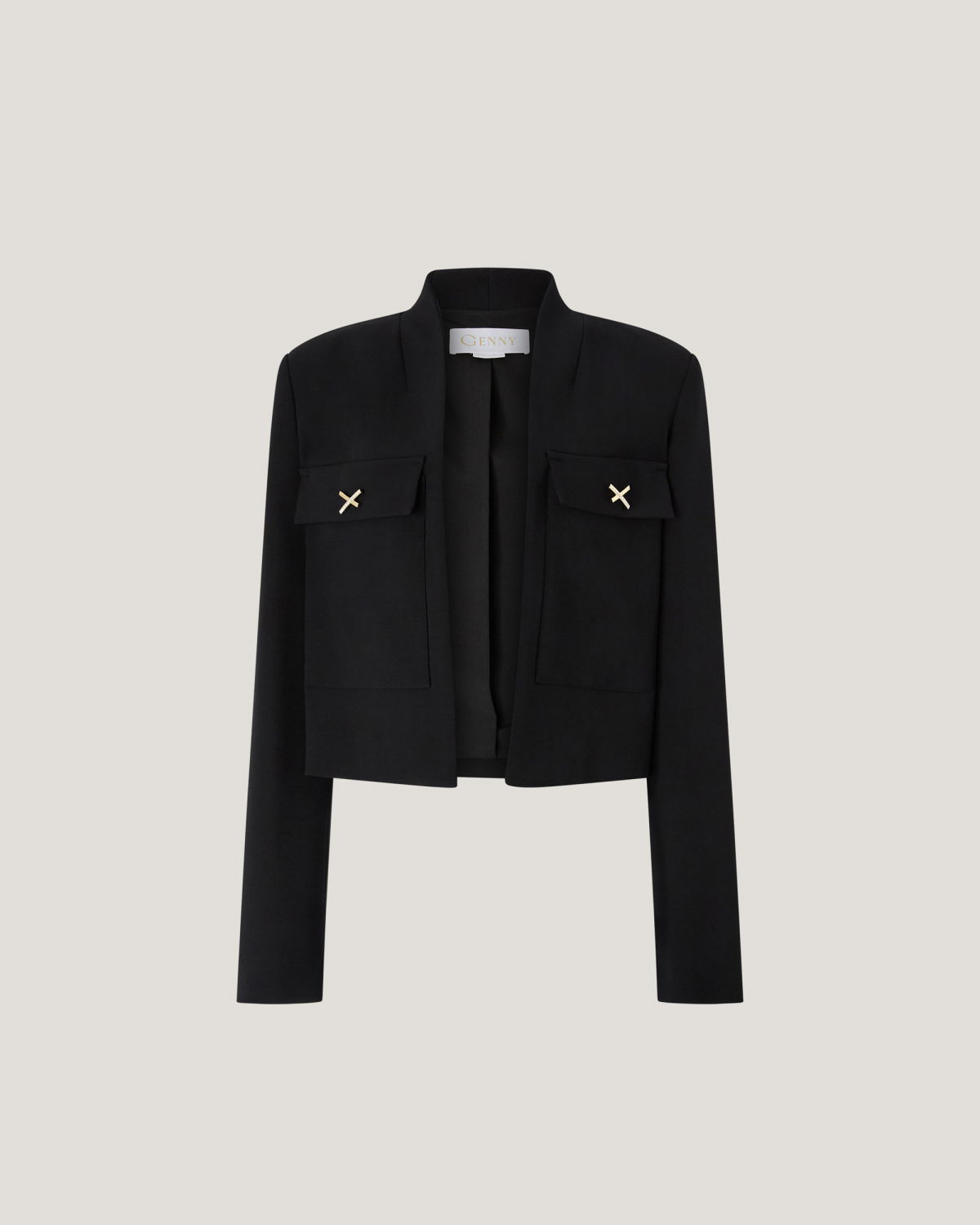 Short jacket in lightweight cady, featuring a clean design with a flat collar that gently rises at the neckline. The maxi patch pockets on the front are embellished with the iconic jeweled X detail with rhinestones, adding a refined touch of light. With its straight fit and waist length, it defines a modern and versatile silhouette, ideal to complete both elegant and contemporary looks.