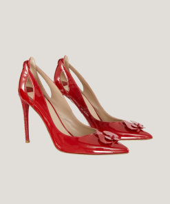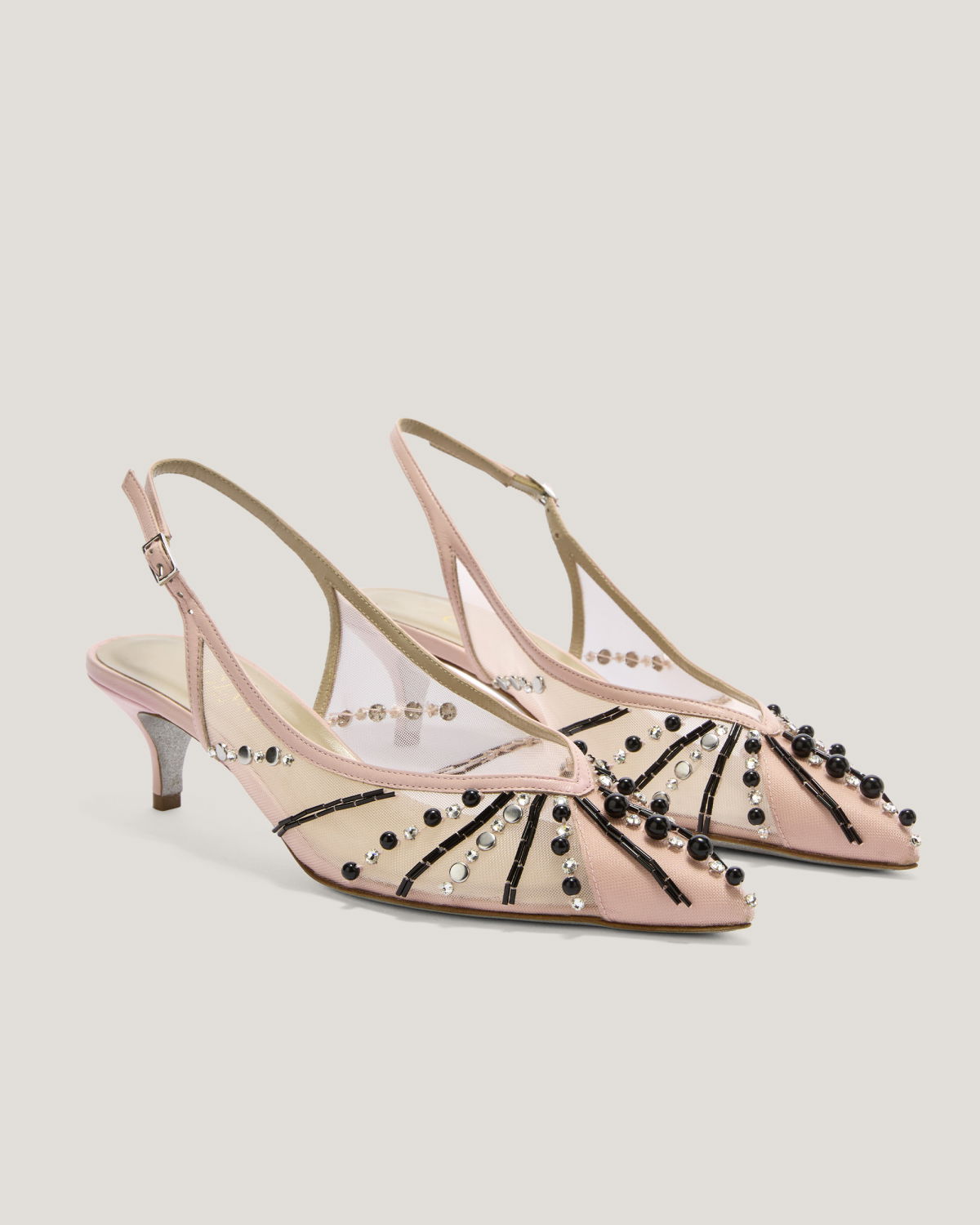 Slingback pumps with a low heel that combine elegance and modernity. Crafted in transparent mesh with leather trims, they are embellished with embroidery and luminous applications of pearls and crystals, creating a refined graphic design. The kitten heel adds comfort and versatility, making them perfect for evening looks or special occasions.