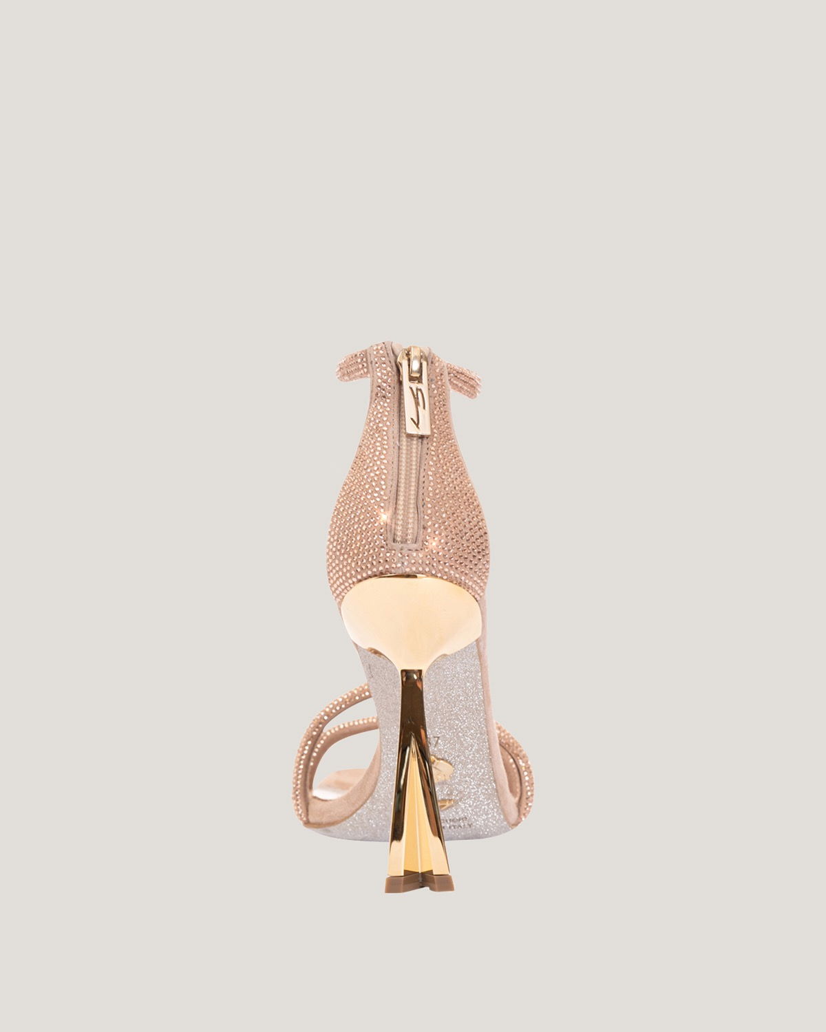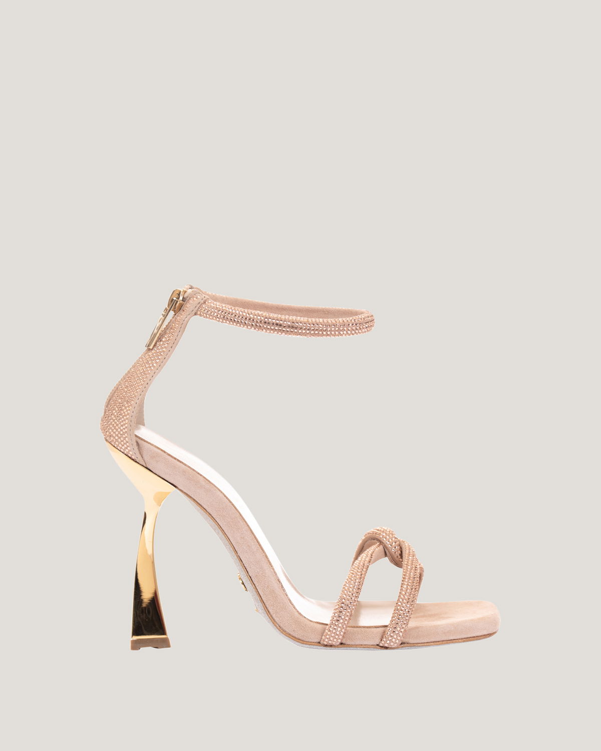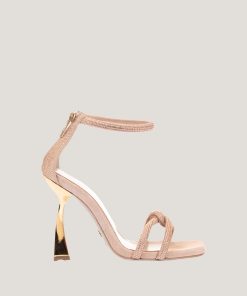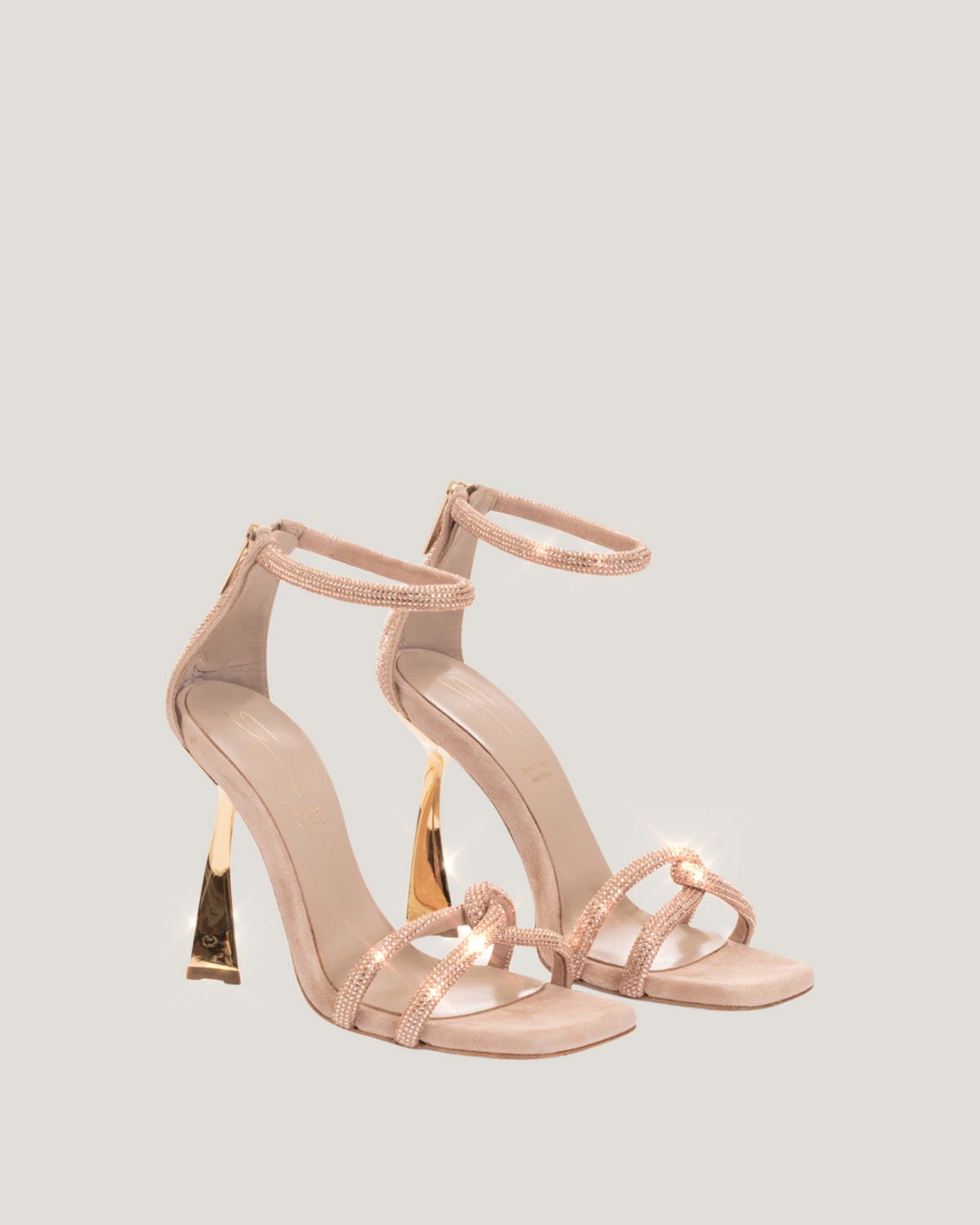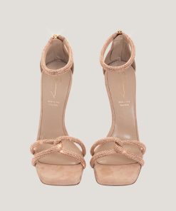 A curved-heeled open toe sandal adorned by a delicate weave embellished with rhinestones featuring an ankle tie strap that enwraps the foot. Hand-crafted in Italy from the finest materials this high heeled sandal is a seasonal must-have.