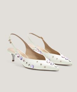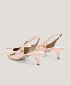 These elegant slingback pumps by Genny, crafted in leather, feature a pointed toe and are embellished with sparkling multicolor crystals. The thin strap with adjustable buckle ensures a secure fit, while the mid heel offers both comfort and style. Perfect for formal occasions or to add a sophisticated touch to casual looks.