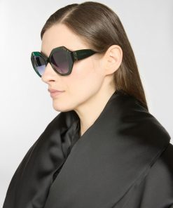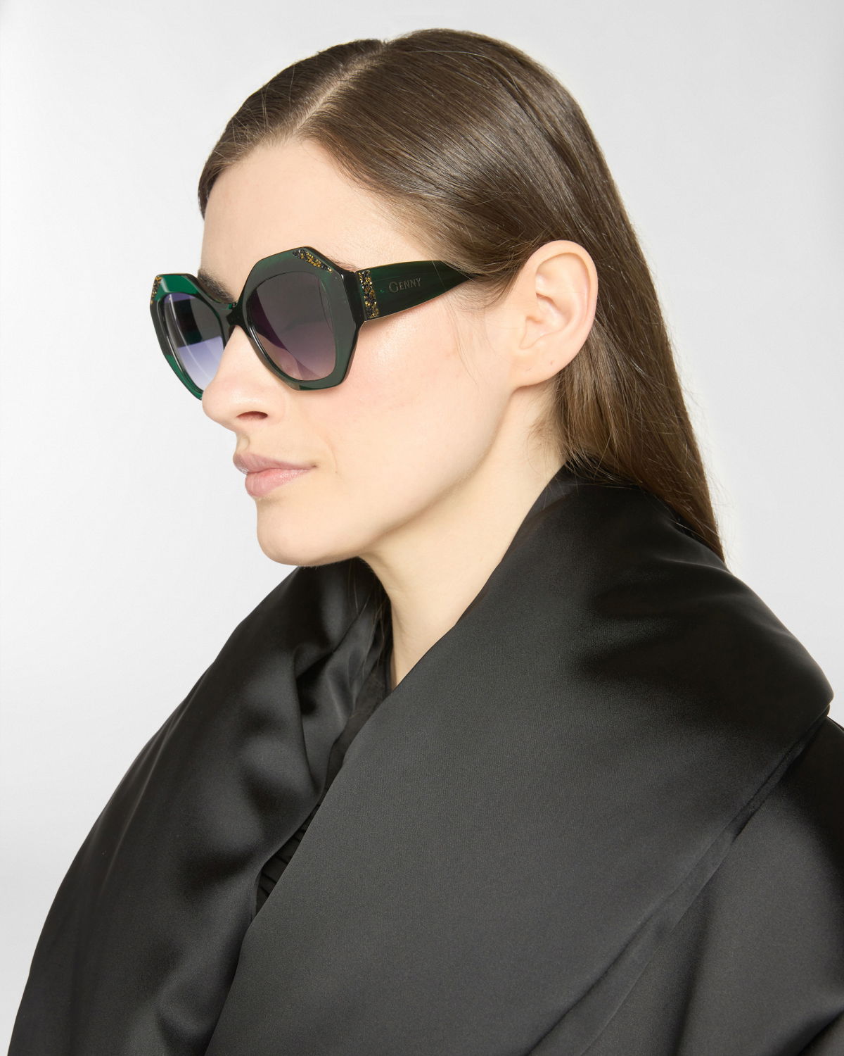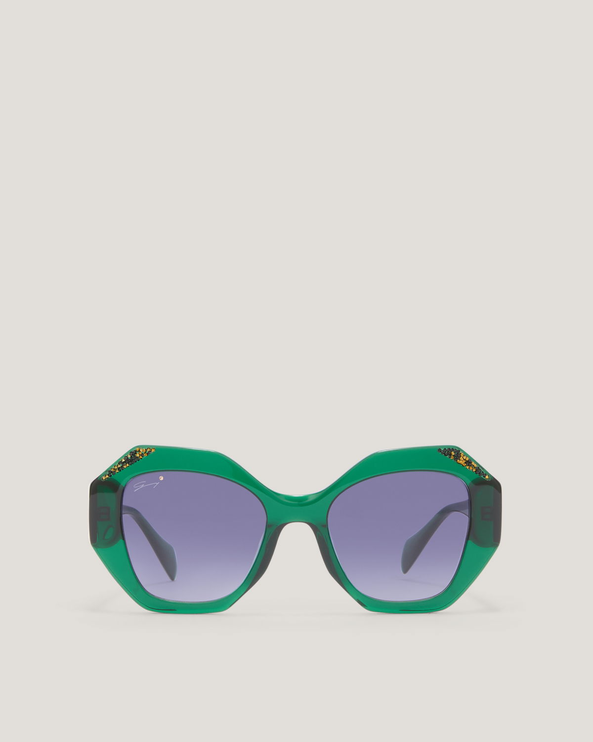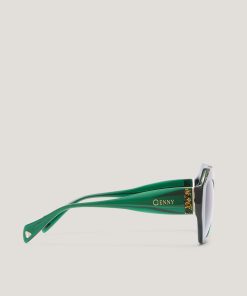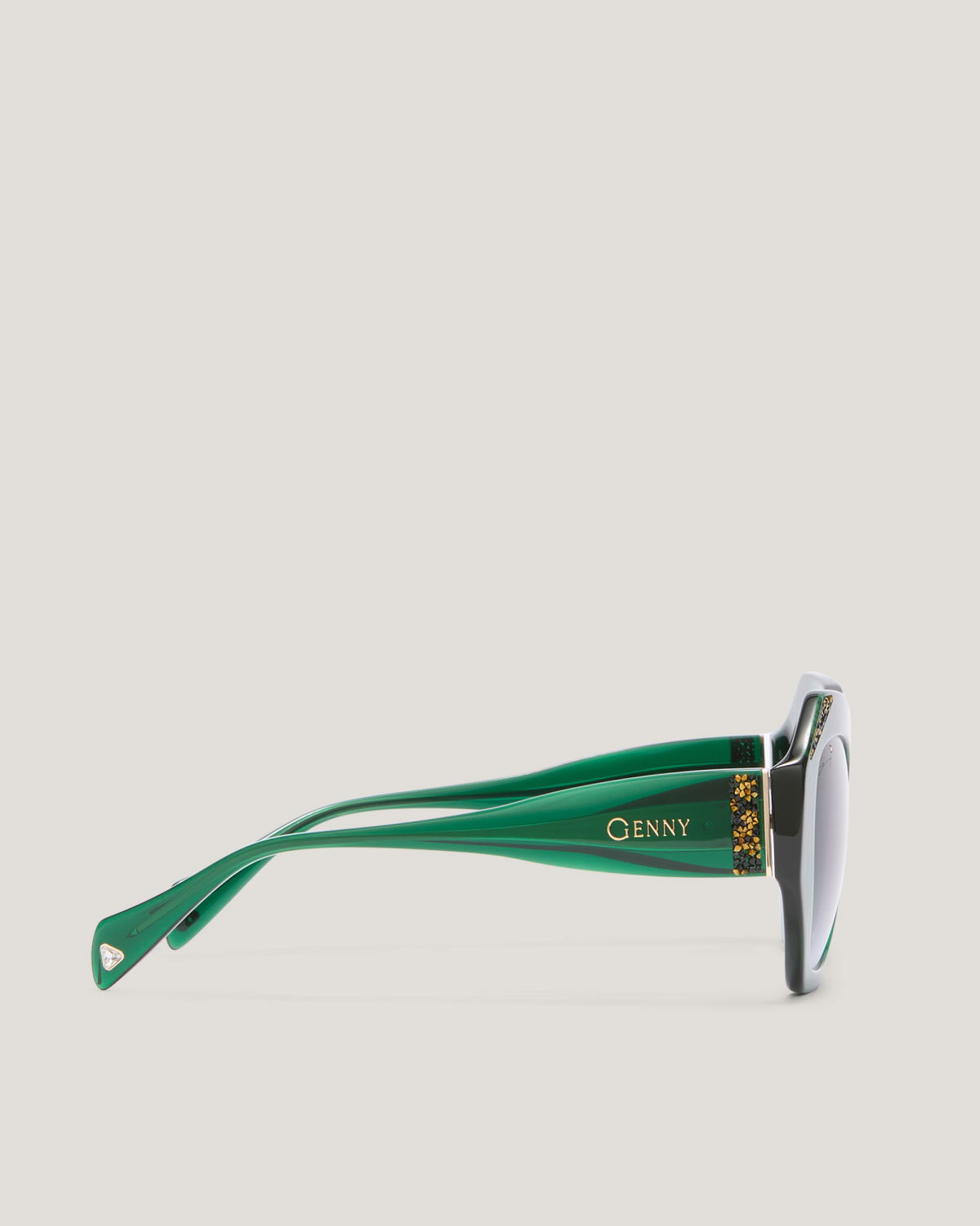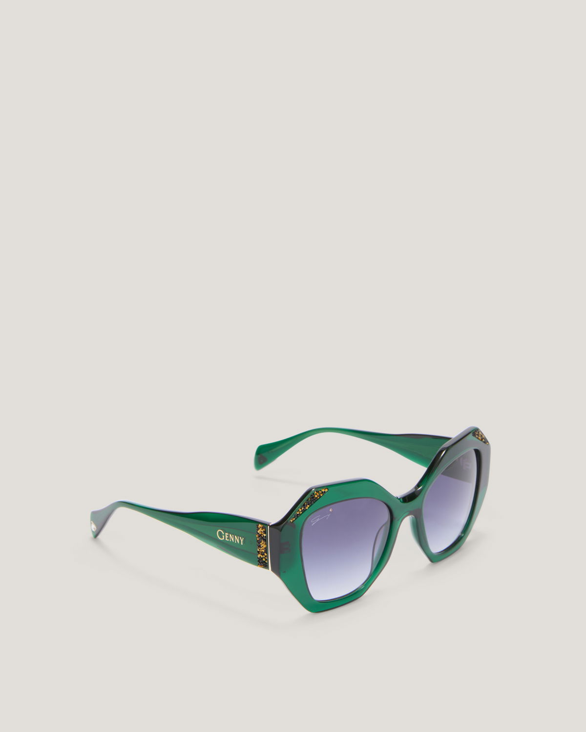 Bold and refined, these oversized sunglasses are crafted in emerald green acetate with shaded lenses. The sculptural frame is adorned with golden crystal details, while the Genny logo on the temples adds a discreet signature.